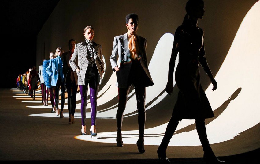 Deixando para trás as temporadas de coleções em preto para trás, a Saint Laurent variou sua cartela de cores com vermelhos, amarelos e roxos.