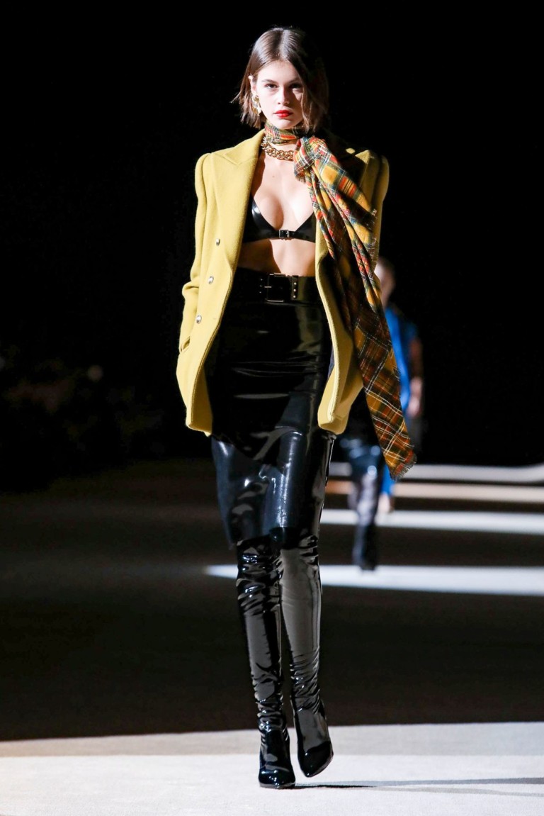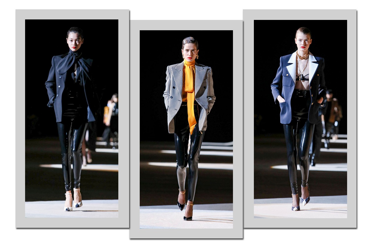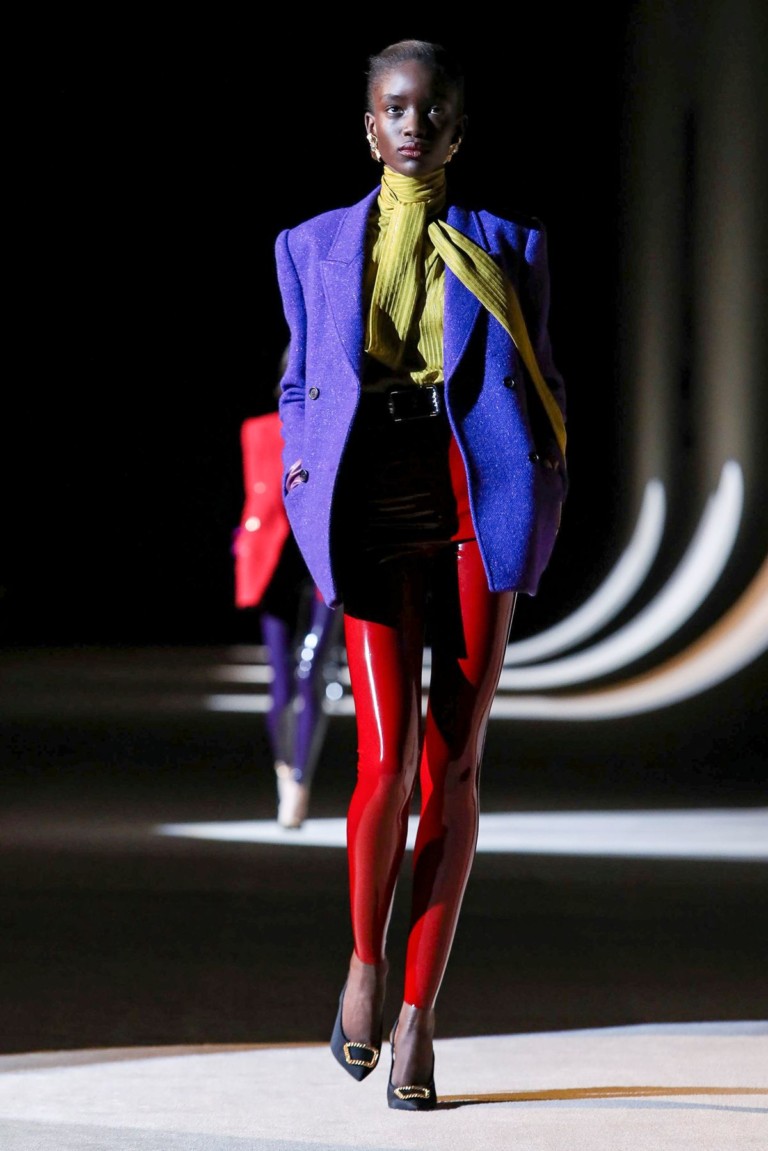 A maior aposta do inverno 2020 da Saint Laurent é a combinação da legging preta – feita de látex – com blazers de diferentes cores e shapes.