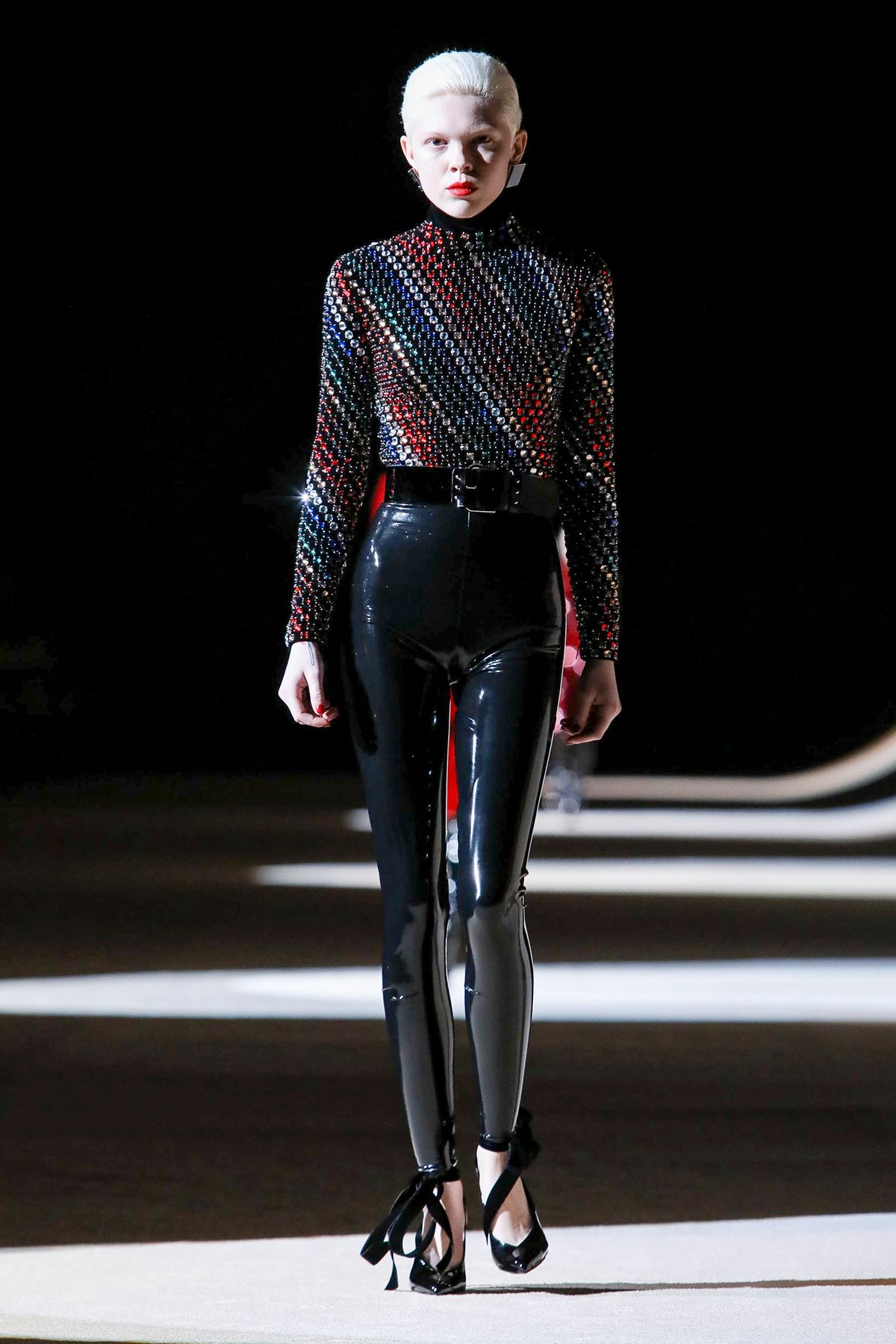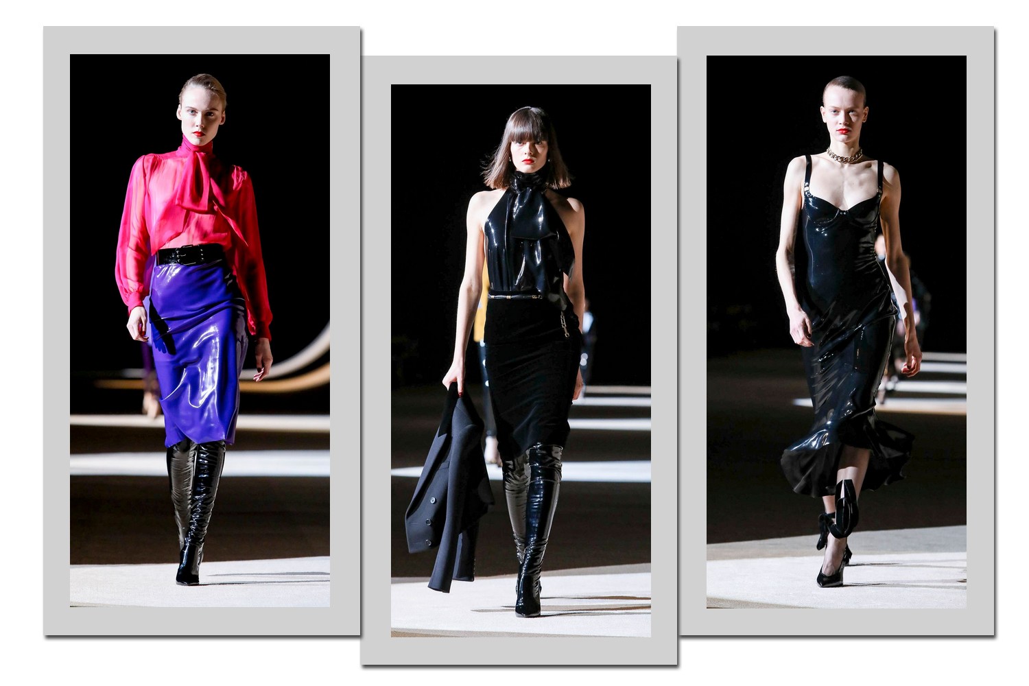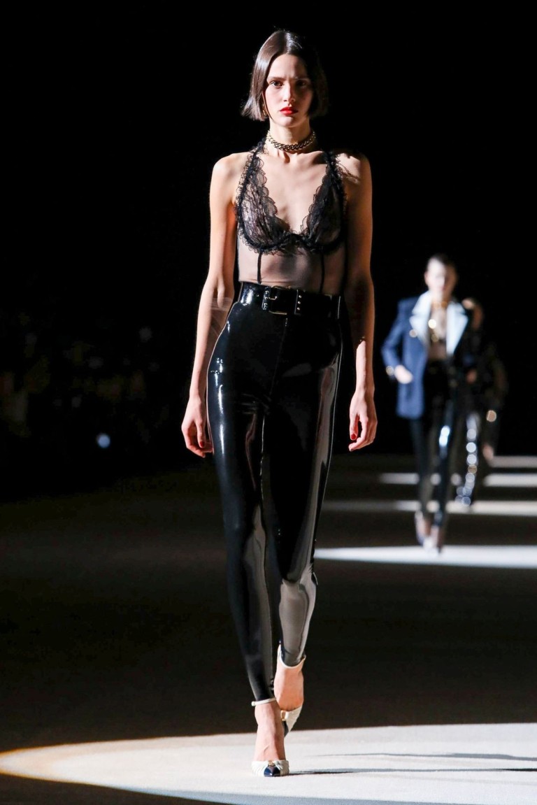 A maior aposta do inverno 2020 da Saint Laurent é a combinação da legging preta – feita de látex – com blazers de diferentes cores e shapes.