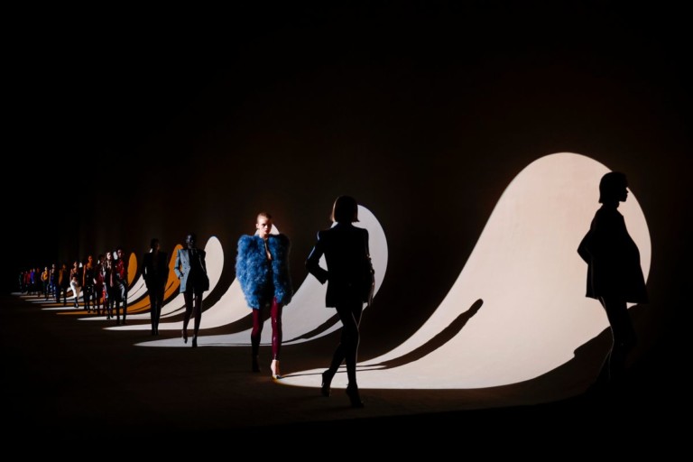 Aos pés da Torre Eiffel, a passarela deu o mood ao desfile. Em meio à escuridão, focos de luz apresentavam e criavam sombras nas modelos.