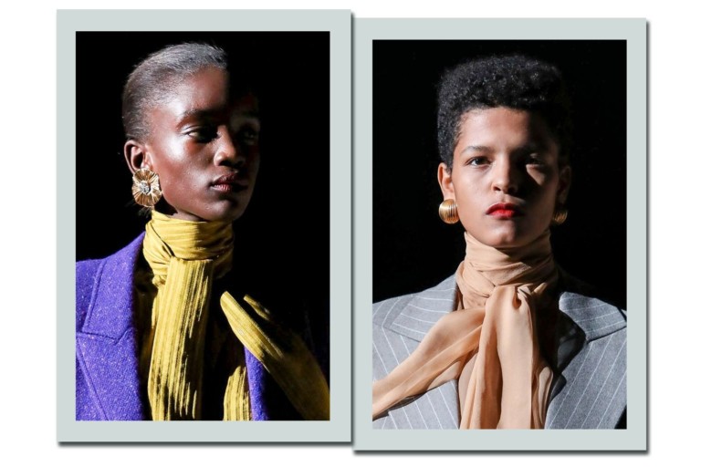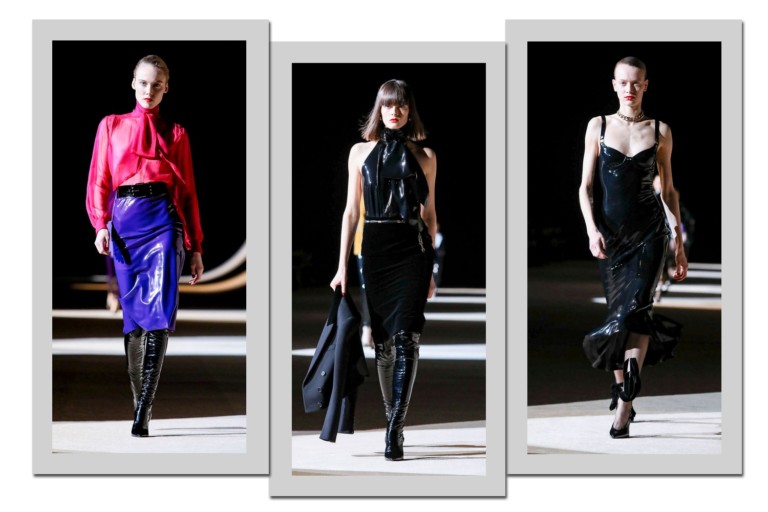 Xadrezes, couro e lã surgem em tops combinados à brilhos molhados como o do látex. Estrela da noite, ele acende peças ousadas e revela uma dominatrix repaginada – é ou não a essência de Yves para 2020? Até a clássica camisa com jabot ganha ar “tough” associada às calças coladas e brilhantes. O material também está em saias, blazers e vestidos.
