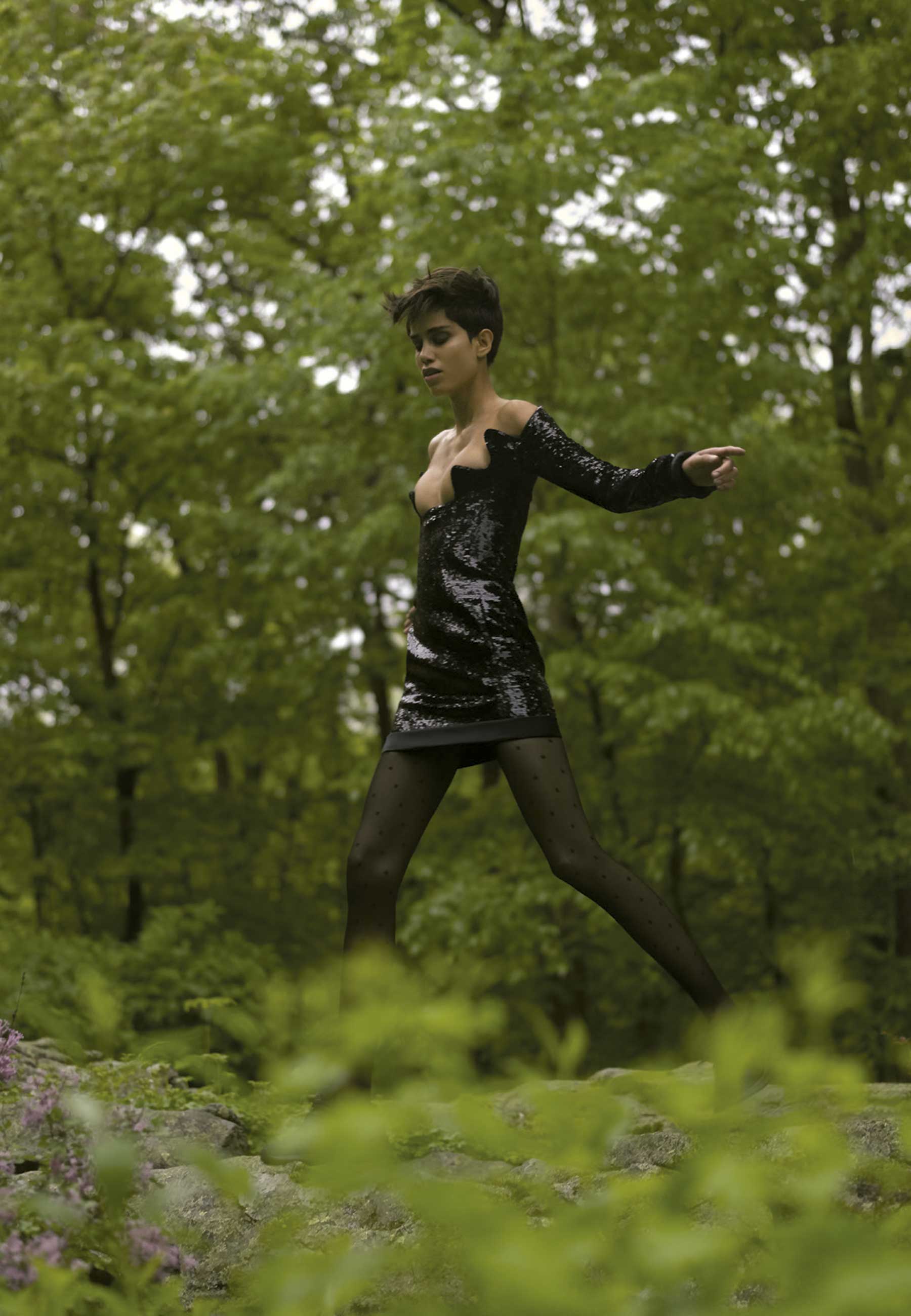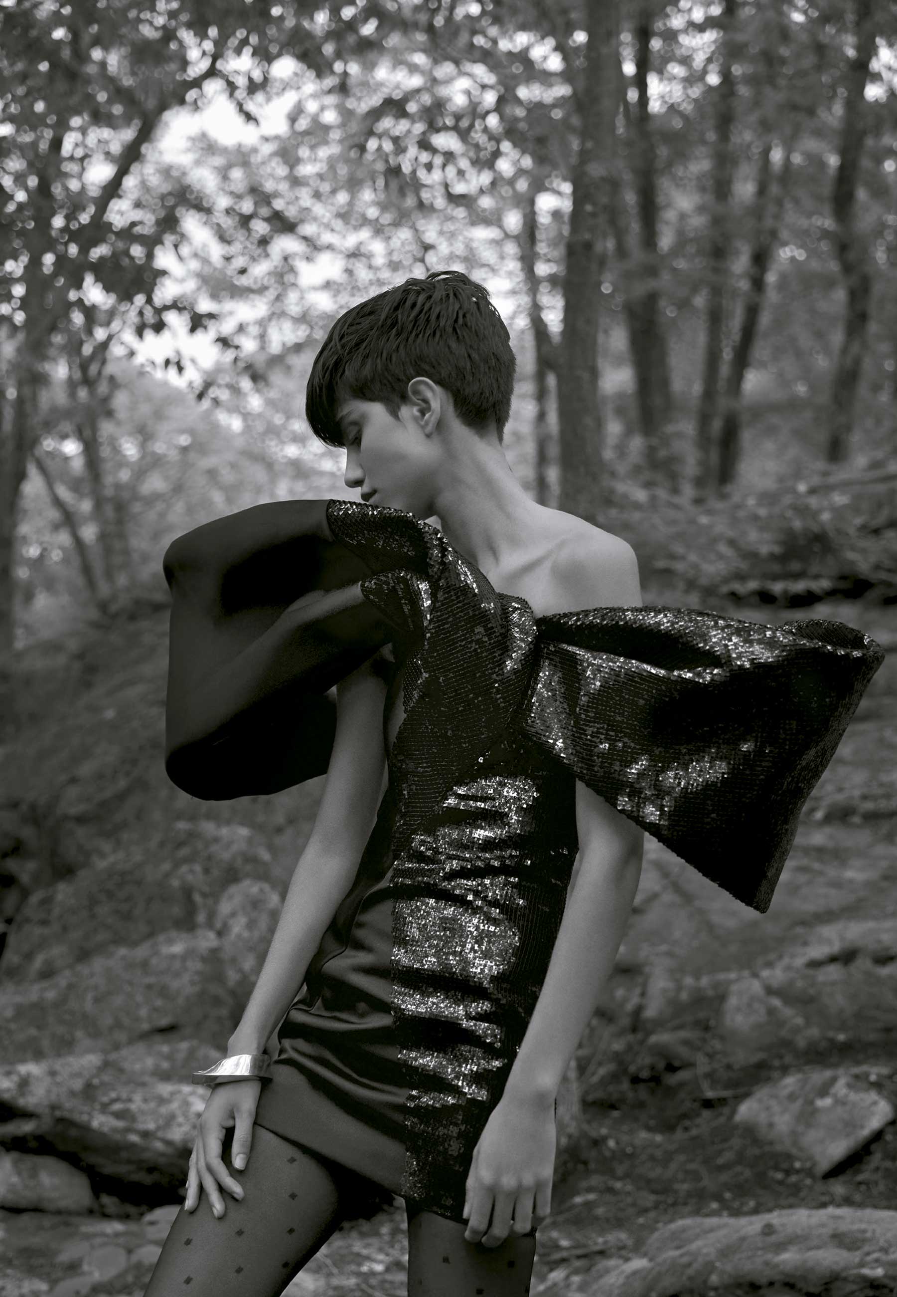 Vestido de paetês, meia-calça e sapatos Saint Laurent, por Anthony Vaccarello.