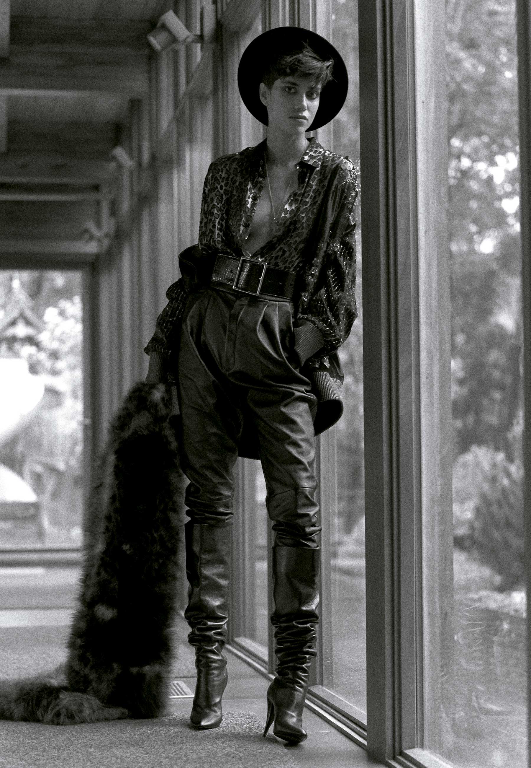 Camisa, casaco, calça de couro, chapéu, colar, cinto, estola e botas Saint Laurent, por Anthony Vaccarello.