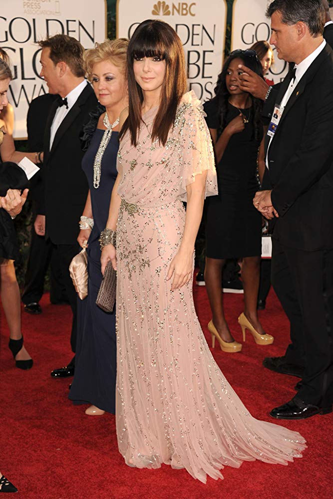 Em um dos seus looks mais clássicos, Sandra Bullock abusou do preto e branco. O modelo foi arrematado por toques de dourado na cintura e nos ombros.