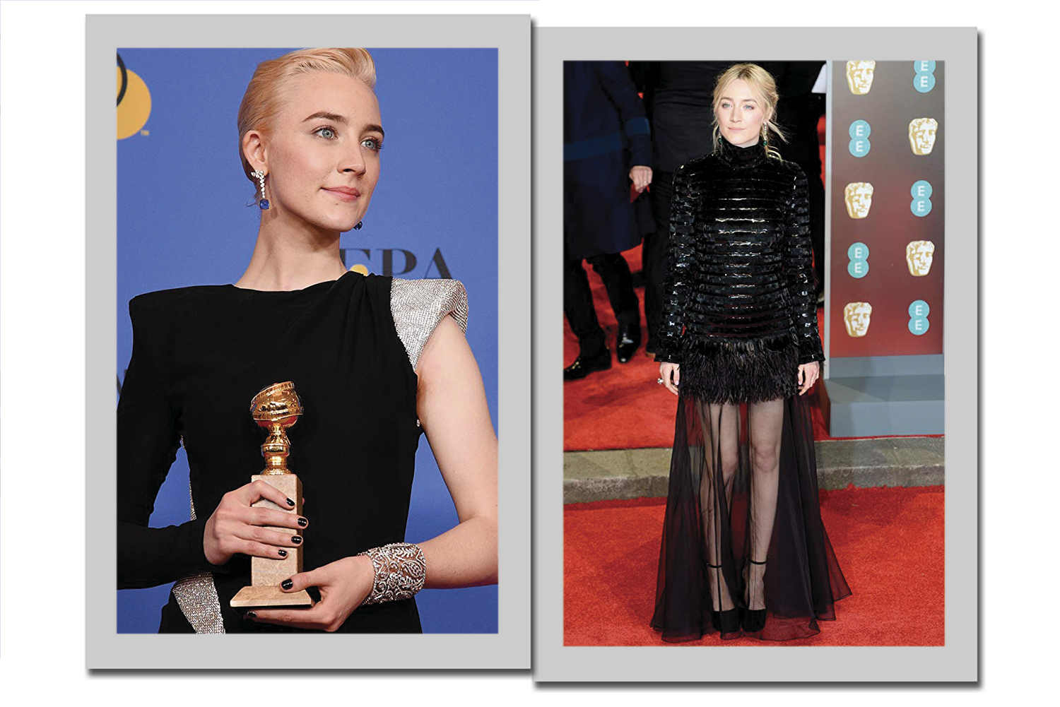Para usar o look todo preto, Saoirse aposta em detalhes como o bordado ou a transparência para equilibrar o visual.