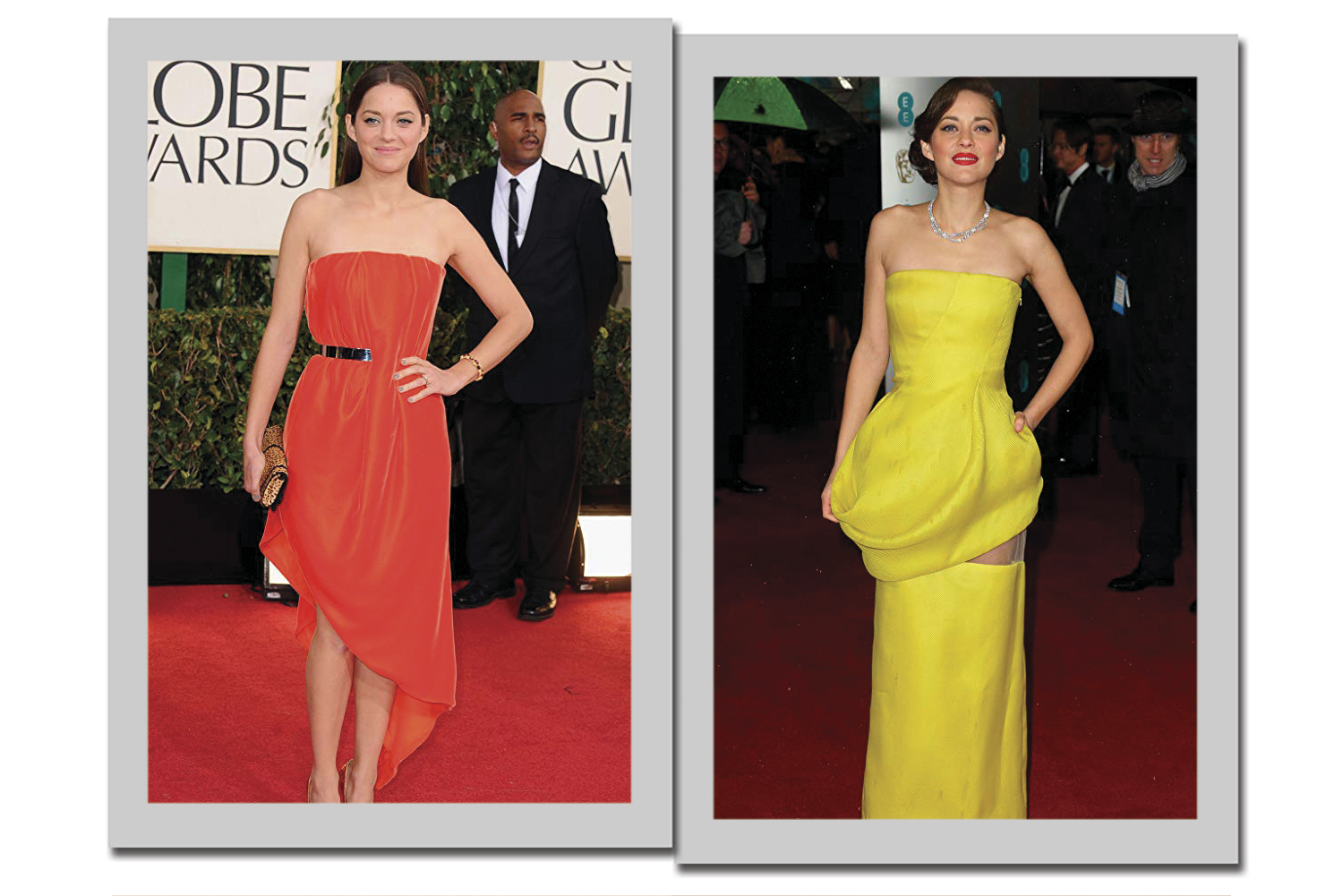 2. Cores quentes são escolhas recorrentes no guarda-roupa de Marion Cotillard. O vermelho e o amarelo proporcionam informação de moda por si só, e não precisam de bordados ou rendas para enriquecer os modelos. Interessante perceber como a modelagem dos vestidos é que carrega o estilo.