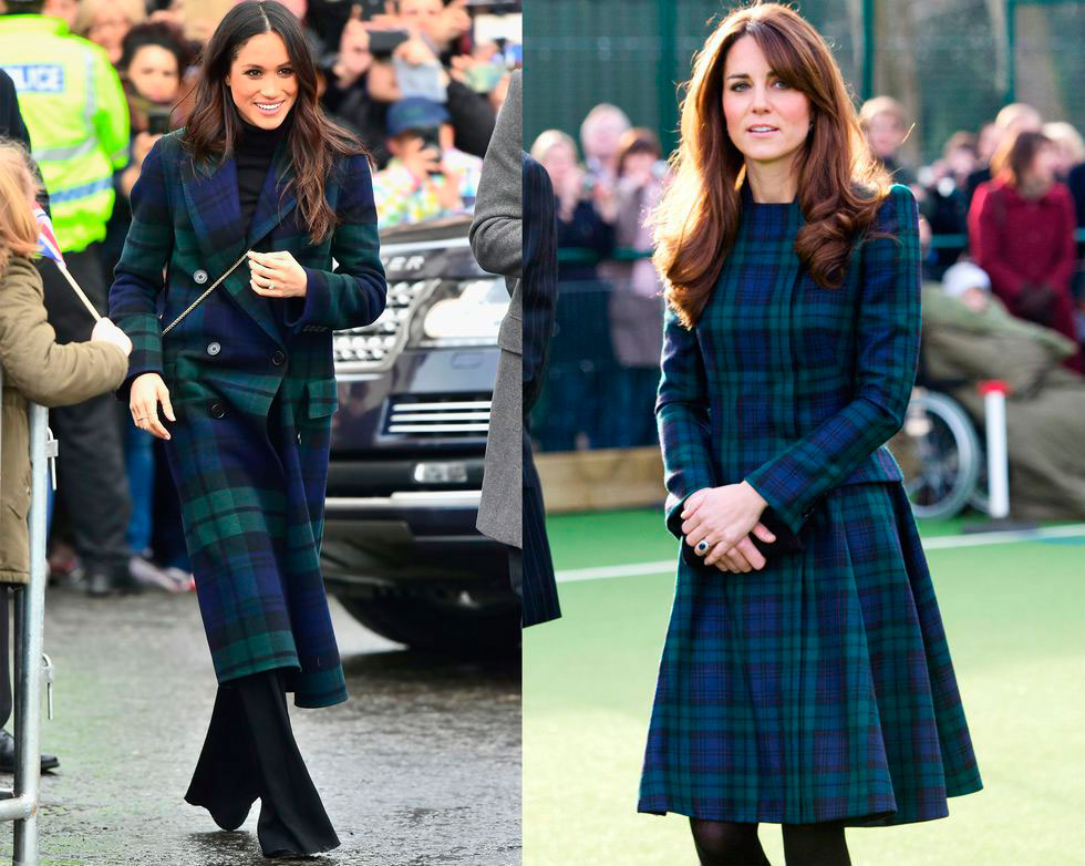 As duas têm gosto bem similar para o xadrez, e amam o tartan verde e azul. Meghan usou o casaco da Burberry em fevereiro de 2018, enquanto Kate desfilou o vestido-casaco de Alexander McQueen com print bem similar em 2012.
