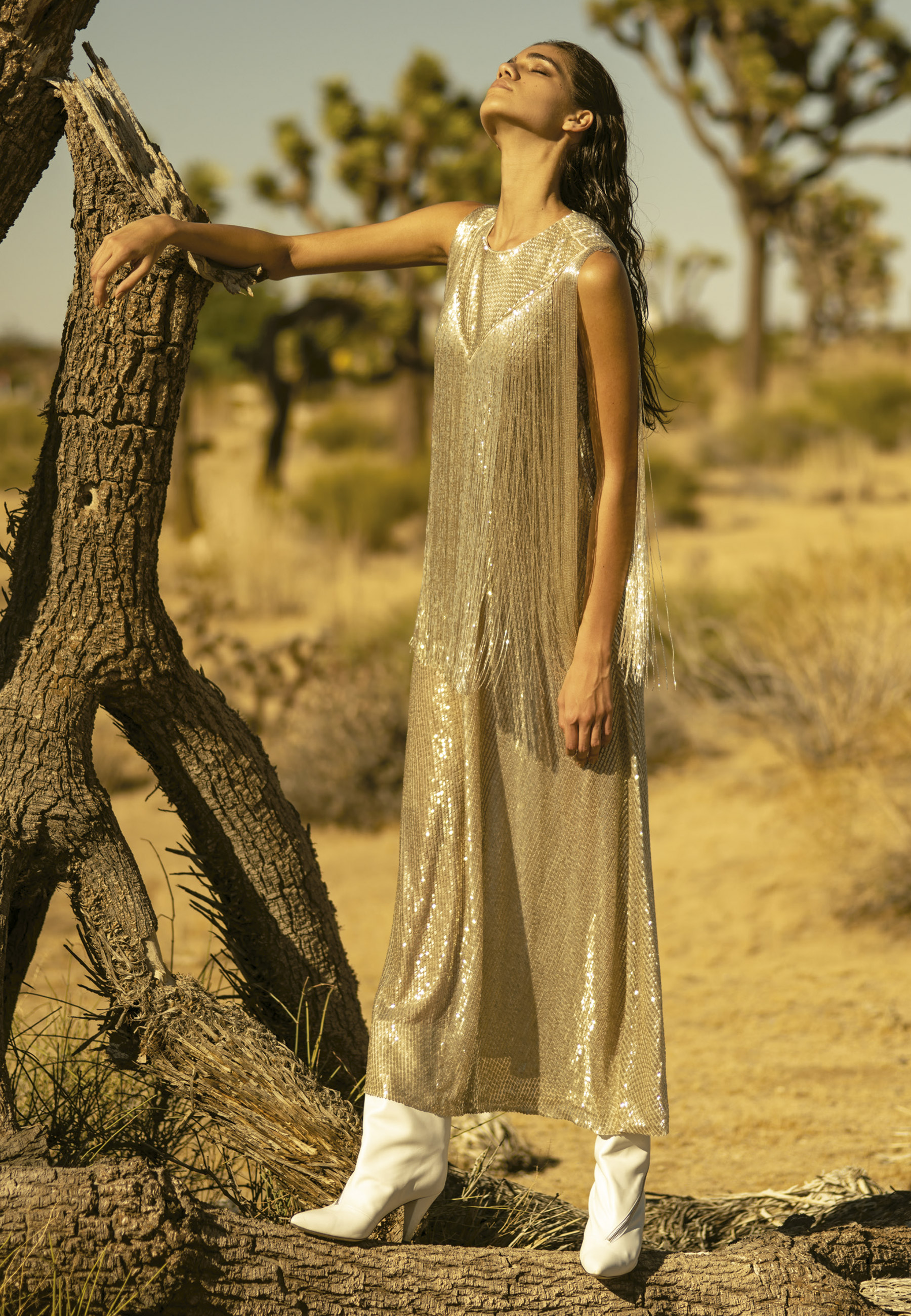 Samile Bermannelli (Mega e Elite NY) usa vestido e botas Chloé; brincos, colar, pulseiras e anéis Cartier – Foto: Ace Amir, com edição de moda Jahulie Elizalde, edição executiva de Filipa Bleck, cabelo de Erol Karadag, maquiagem de Ryan Burke, manicure Riwako Kobayashi, set design de Colin Lytton e movement director Michael Spencer Phillips