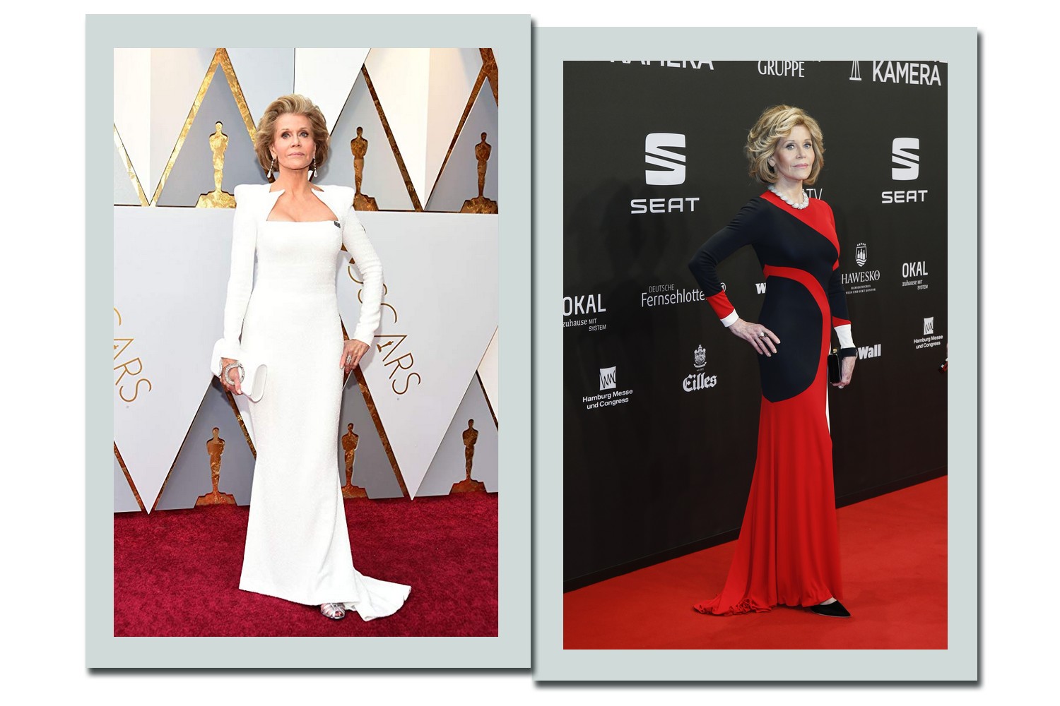 Jane Fonda é fã de modelagens mais justas, que criam um visual sereia com caudas discretas. Para a cerimônia do Oscar de 2018, a atriz escolheu um vestido branco da Balmain, que além do formato sereia, tem um decote geométrico com recortes triangulares no colo. Outra peça icônica usada pela atriz foi o modelo da Naeem Khan, todo estampado em vermelho, preto e branco.