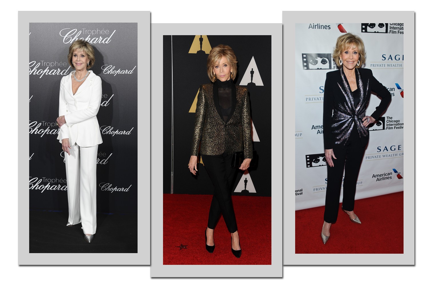 Outra aposta certeira de Jane Fonda são os terninhos, extremamente elegantes e perfeitos para diversas situações. Além das versões lisas e clássicas, a atriz já desfilou com modelos mais ousados, como o Saint Laurent que mistura animal print e uma camisa transparente. Em outro evento, o escolhido foi o modelo bordado da Azzaro Couture.