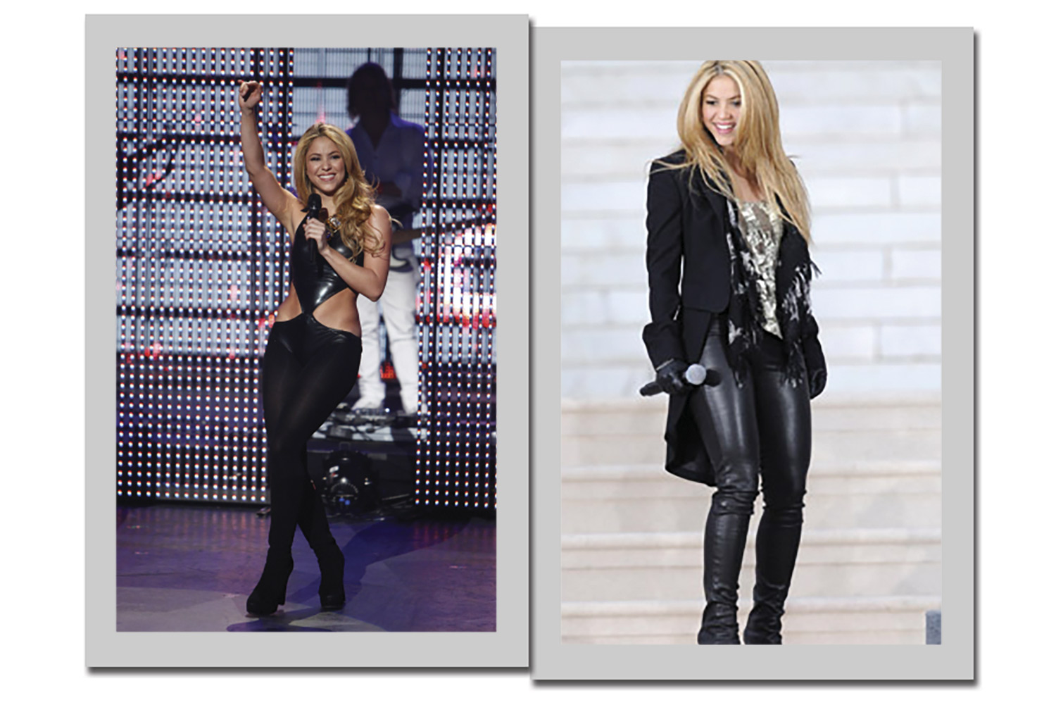2. O all black é uma opção constante para a cantora. Ele garante finesse mesmo nas peças de roupa mais ousadas, como o macacão com recortes ao longo do tronco. E até no inverno Shakira fica sexy. As calças de couro justas alongam o visual e combinam com qualquer trench coat.