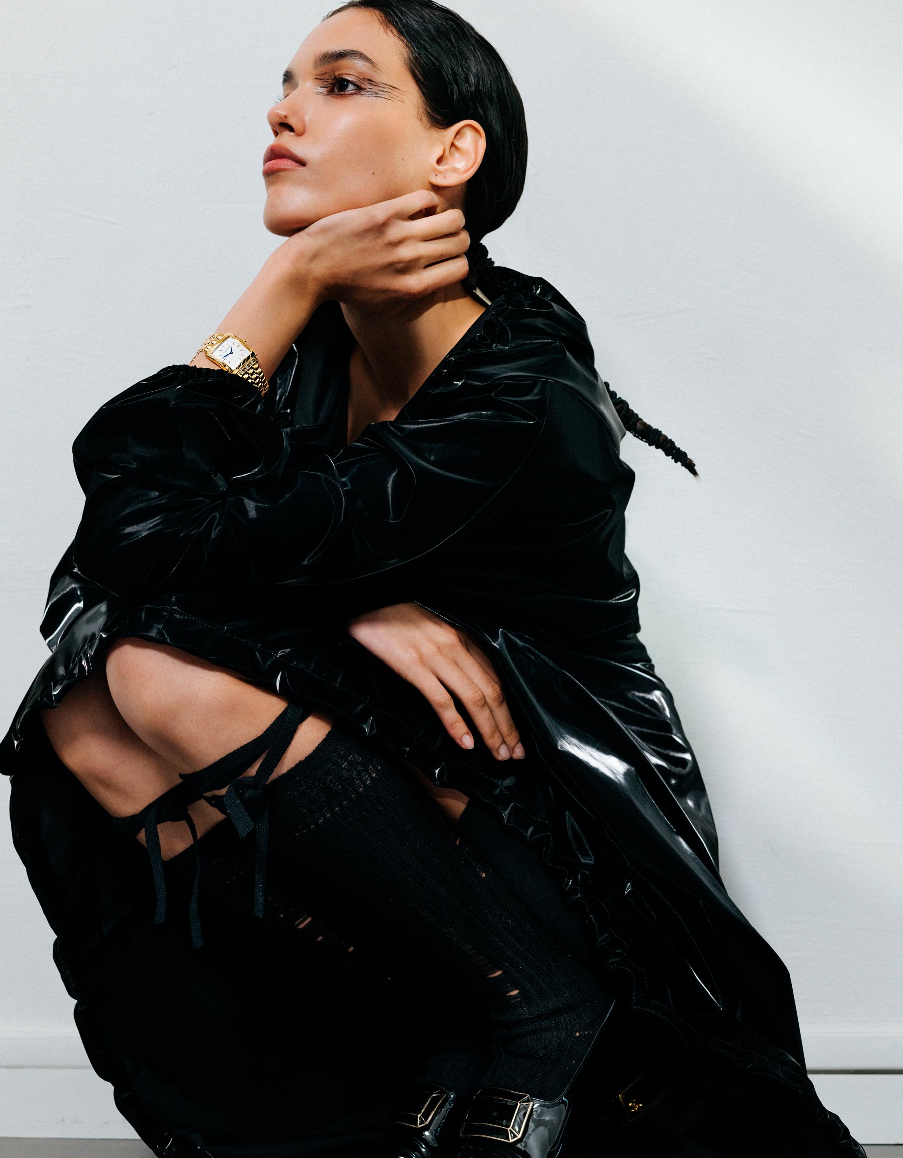 Iza Dantas usa casaco Alexandre Vauthier, relógio Sain Honoré Paris, meias Dior e sapatos Chanel – Foto: Stéphanie Volpato, com styling de Sarah Cazeneuve e edição de moda at large de Filipa Bleck