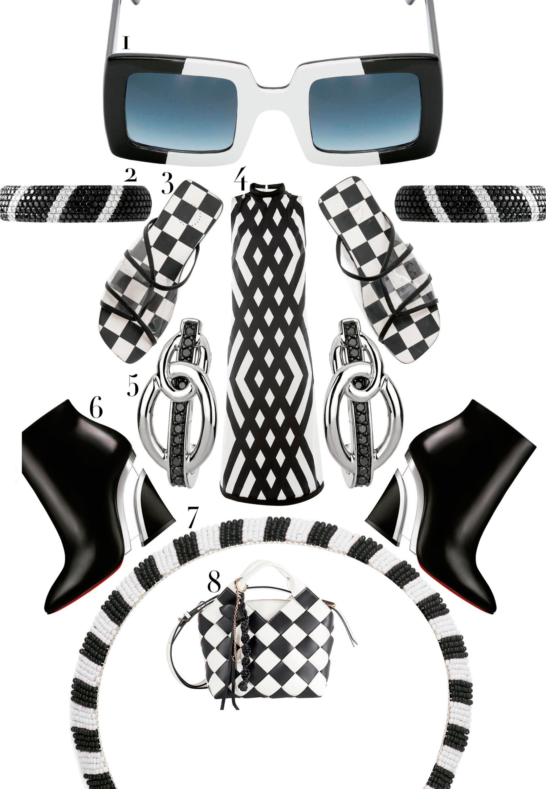 A clássica bandeira quadriculada das corridas automobilísticas inspira looks cheios de personalidade. A combinação PB geométrica ganha um refresh quando desfigurada como efeito de ilusão de ótica. Ouse sem medo.