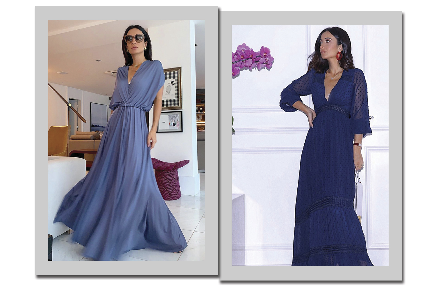 Para um look um pouco mais sério, mas ainda repleto de informação de moda, o azul aparece no guarda-roupa da influencer. Marcar a cintura é essencial, enquanto o decote em V alonga a silhueta.