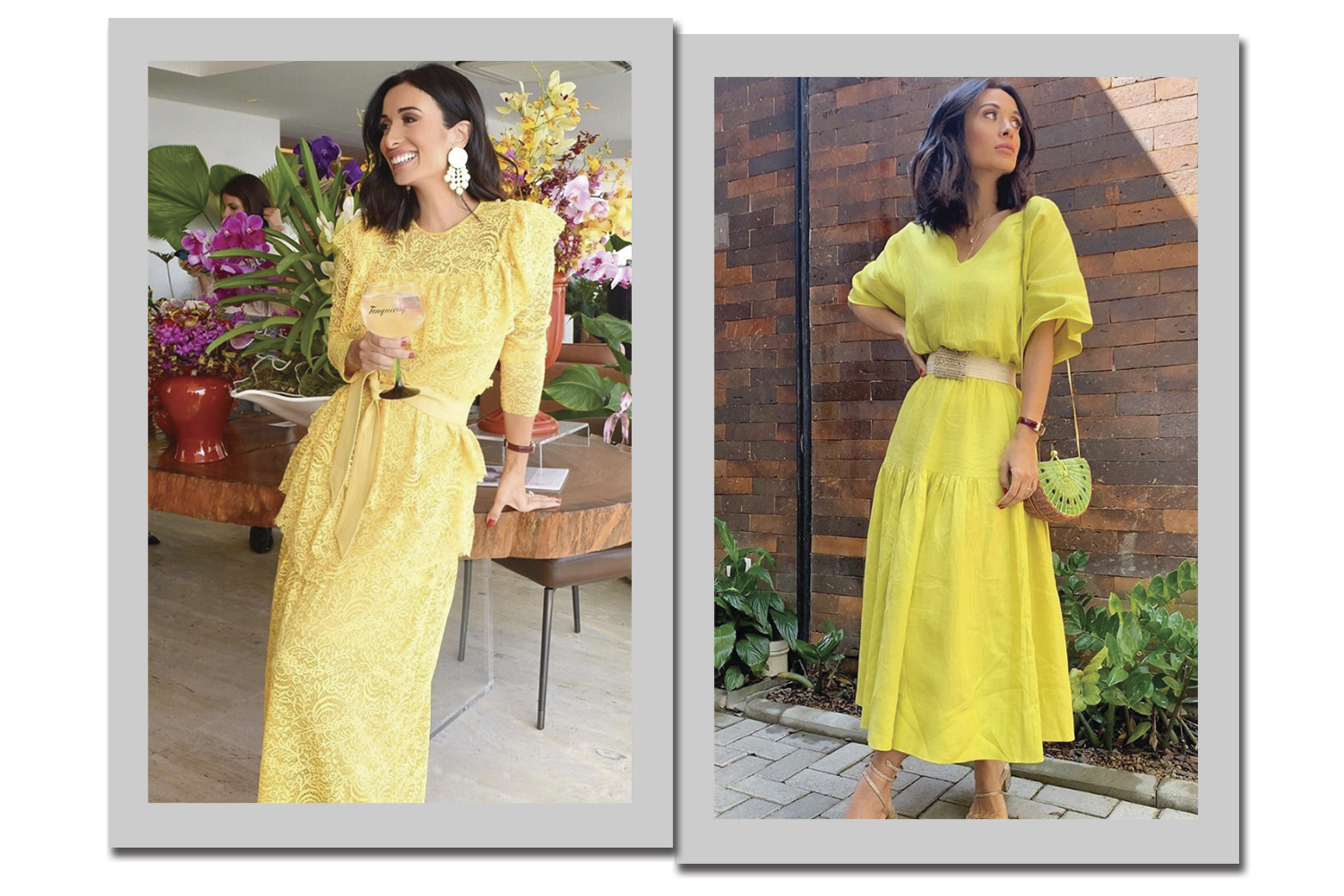 A Yellow Fever garante luz no look. Para arrasar com finesse, Silvia Braz opta por vestidos rendados, com babados ou até com as mangas bufantes. E para fechar o visual, maxibrincos brancos ou a bolsa de kiwi são bem-vindos.
