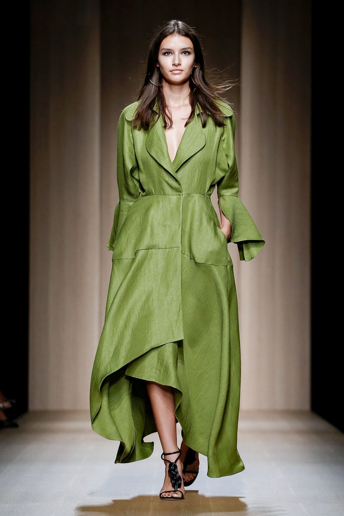 Na foto acima, o vestido verde da Genny é o exemplo perfeito para entender a trend. Com uma modelagem fluída, que marca a cintura, a peça verde tem a costura aparente e movimento. Desta maneira, a informação de moda fica evidenciada, enquanto a simplicidade do estilo sem bordados e sem estampas, faz do look um típico moderno.
