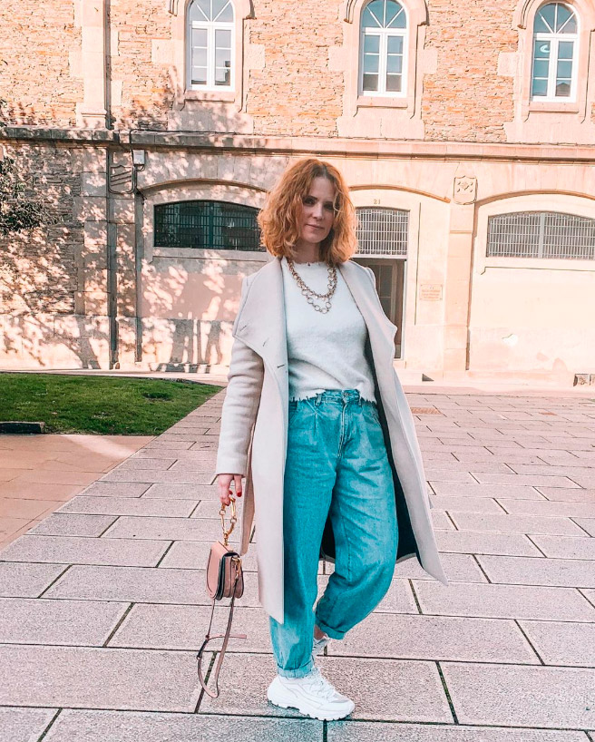 Para um visual mais elegante, você pode optar pela alfaiataria. Se estiver frio, aposte no sobretudo em tom bege e um jeans lavado. Combinação de sucesso na certa.