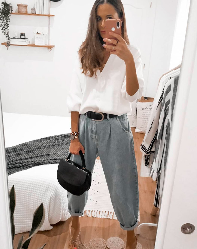 Camisa branca é aquela peça que nunca pode faltar em um guarda-roupa. O slouchy jeans, apesar de mais informal, fica bem elengante quando usada com ela e combinada à sandália metalizada de salto alto. Dá até para sair para jantar direto do trabalho.