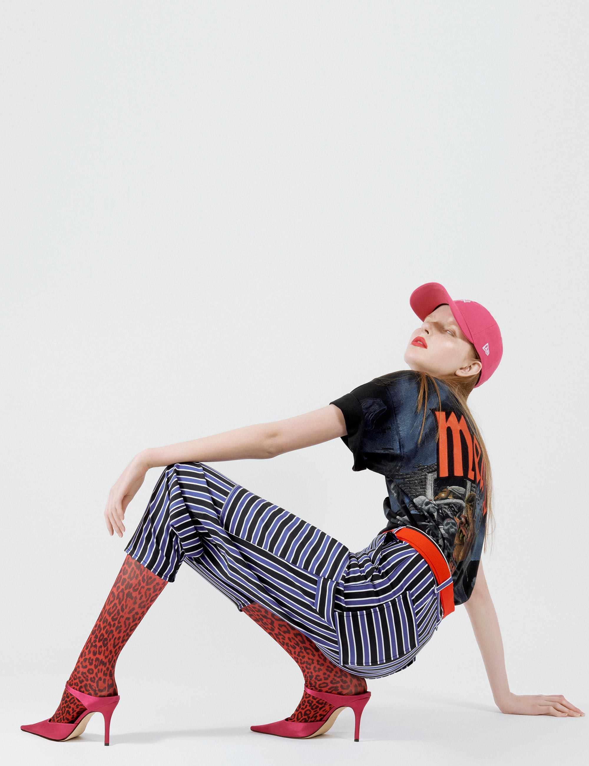 T-shirt B Luxo, calça Reinaldo Lourenço, boné New Era, meia-calça Topshop e escarpin Amaro