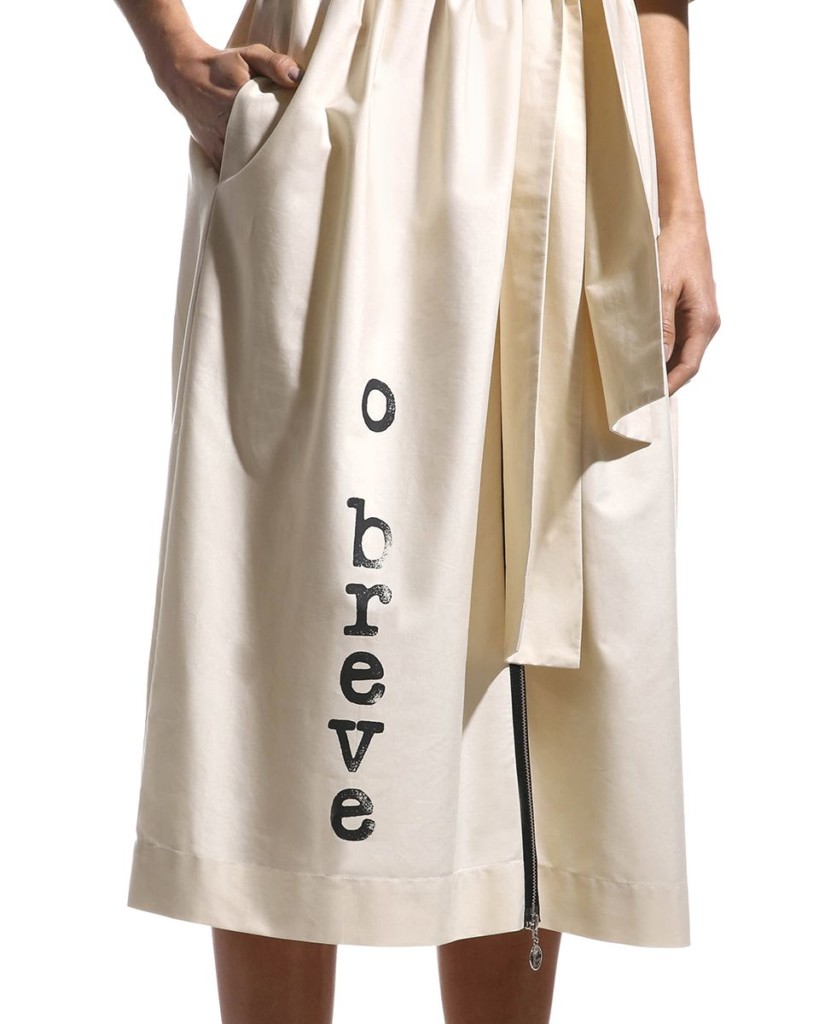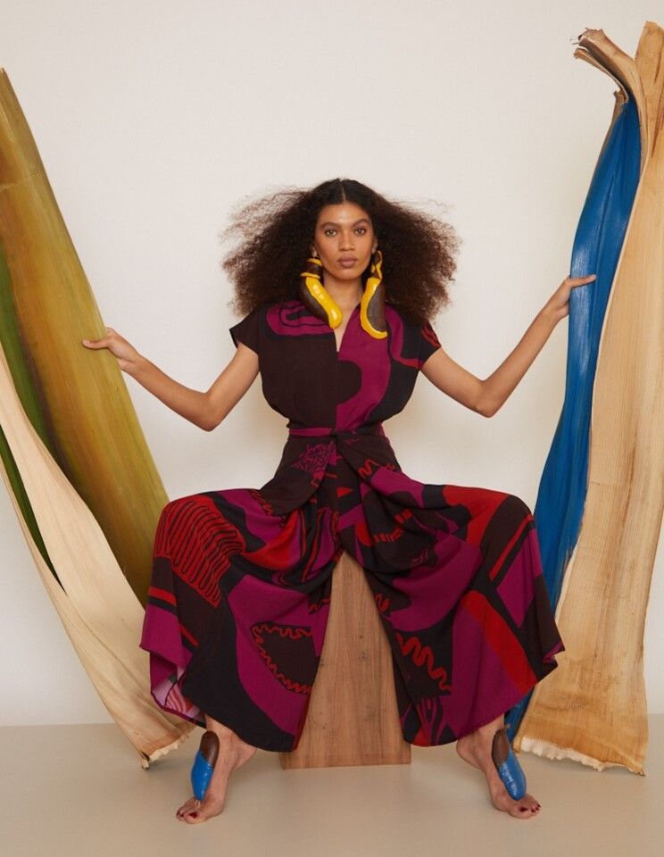 Para a temporada, a estilista trabalha com tecidos como o linho, musseline e seda. As estampas inspiradas no shooting são o ponto alto da coleção. “São prints abstratas que trabalham com cáqui e cores fortes, como o verde limão e o azul neon”, resume. Destaque para as modelagens amplas e fluidas de vestidos, calças, batas e tops de gola alta.