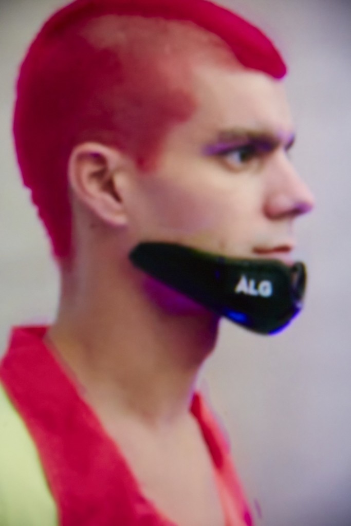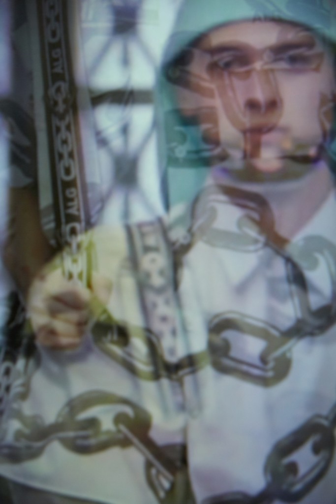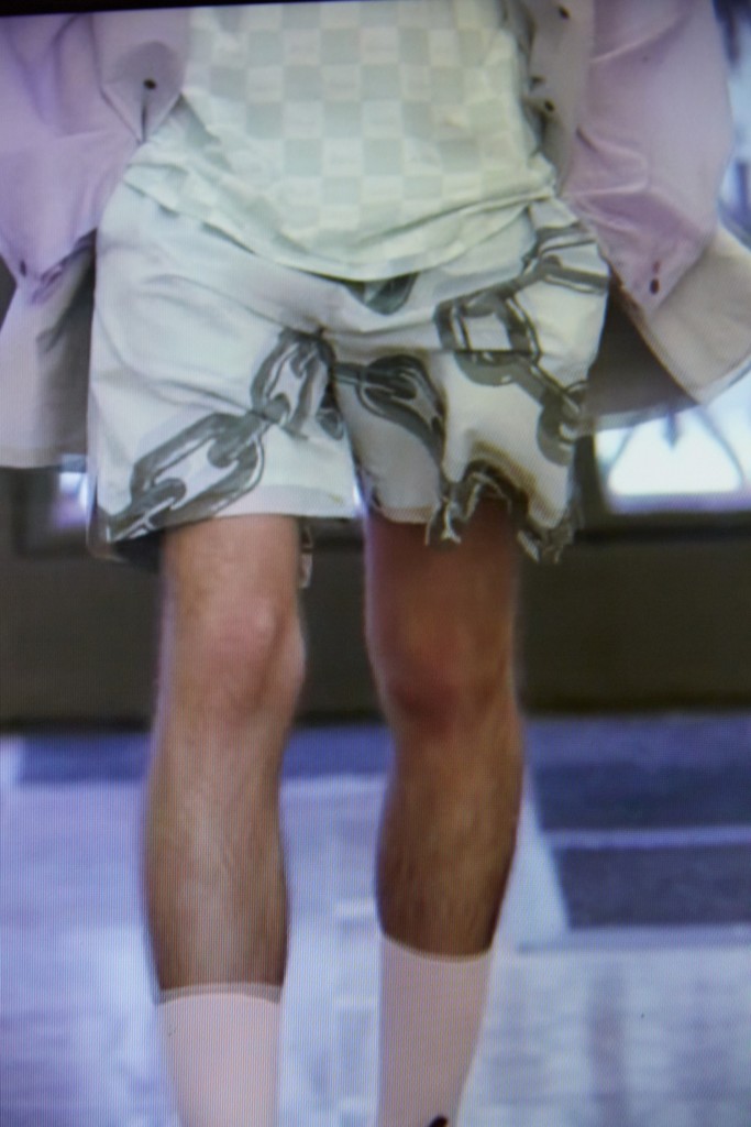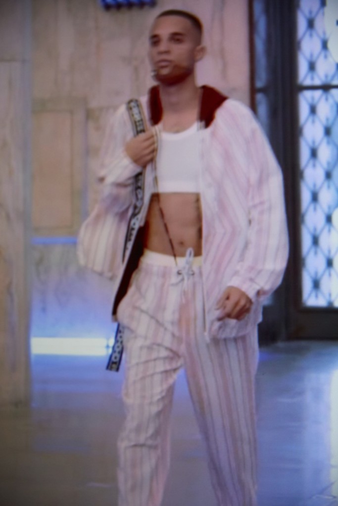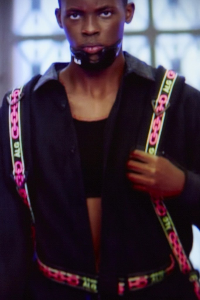Assim como nas básicas camisetas brancas que recebem tratamento deluxe com mangas volumosas pela aplicação deste material. Ironia sempre bem-vinda, o acessórios nos queixos dos modelos remetem ao uso incorreto de máscaras, visto infelizmente durante a pandemia. Mas também podem ser uma possível solução para aqueles que não as usam, uma vez com o queixo já bem enfeitado, será que a mascara cobrirá o nariz e boca?