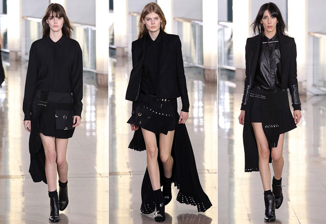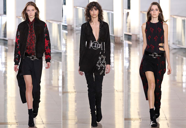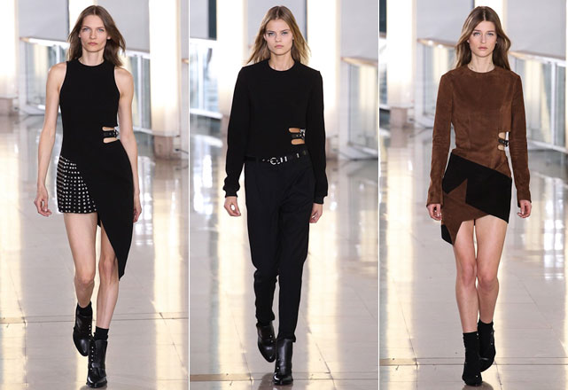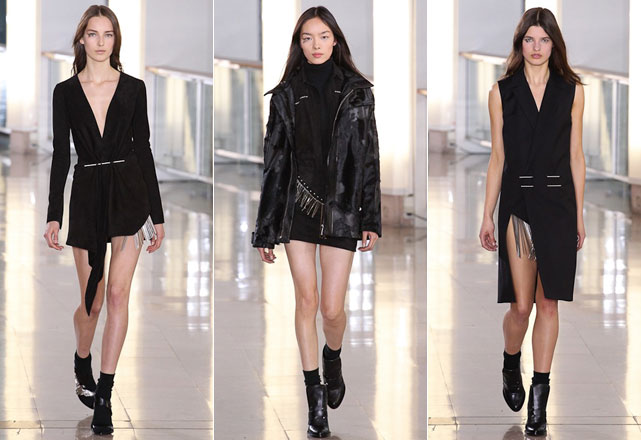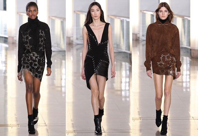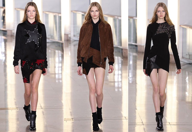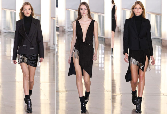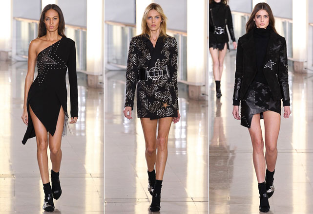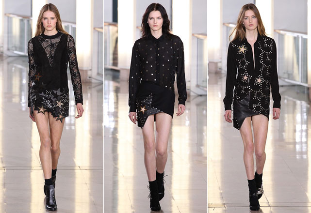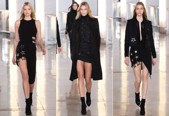 Com suas clássicas fendas, o estilista Anthony Vaccarello apresentou nessa terça-feira (03.03) seu inverno 2015 durante a semana de moda de Paris. Na passarela, o preto e o marrom predominaram nos looks da temporada, com detalhes em vermelho e azul marinho em poucas peças. O shape clássico do estilista, com suas fendas e recortes, traz o formato de estrelas nas barras das saias e vestidos.