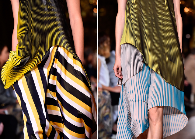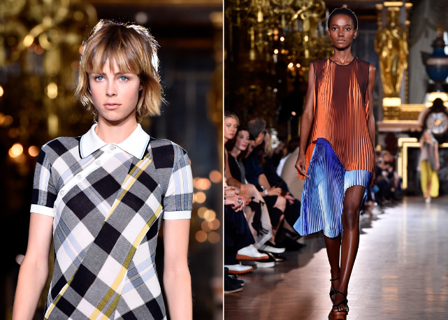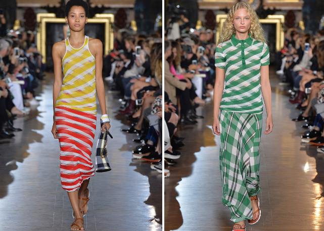 É um acaso muito bem-vindo o fato do desfile de Stella McCartney acontecer no dia seguinte ao da Céline. Assim como Phoebe Philo, McCartney faz parte do grupo de estilitas mulheres criando para mulheres reais, não ideais. E também como Philo, Stella percebeu, já há algumas temporadas, a necessidade de ampliar o escopo de suas coleções, principalmente na passarela. Para o verão 2016, ela reforça a importância do tricô na estação, com pólos de proporções reduzidas sobre longas saias e vestidos do mesmo material; injeta frescor aos plissados-tendência com peças em A com barras assimétricas e cores vibrantes; repensa a alfaiataria sobre a visão fácil e confortável da temporada.