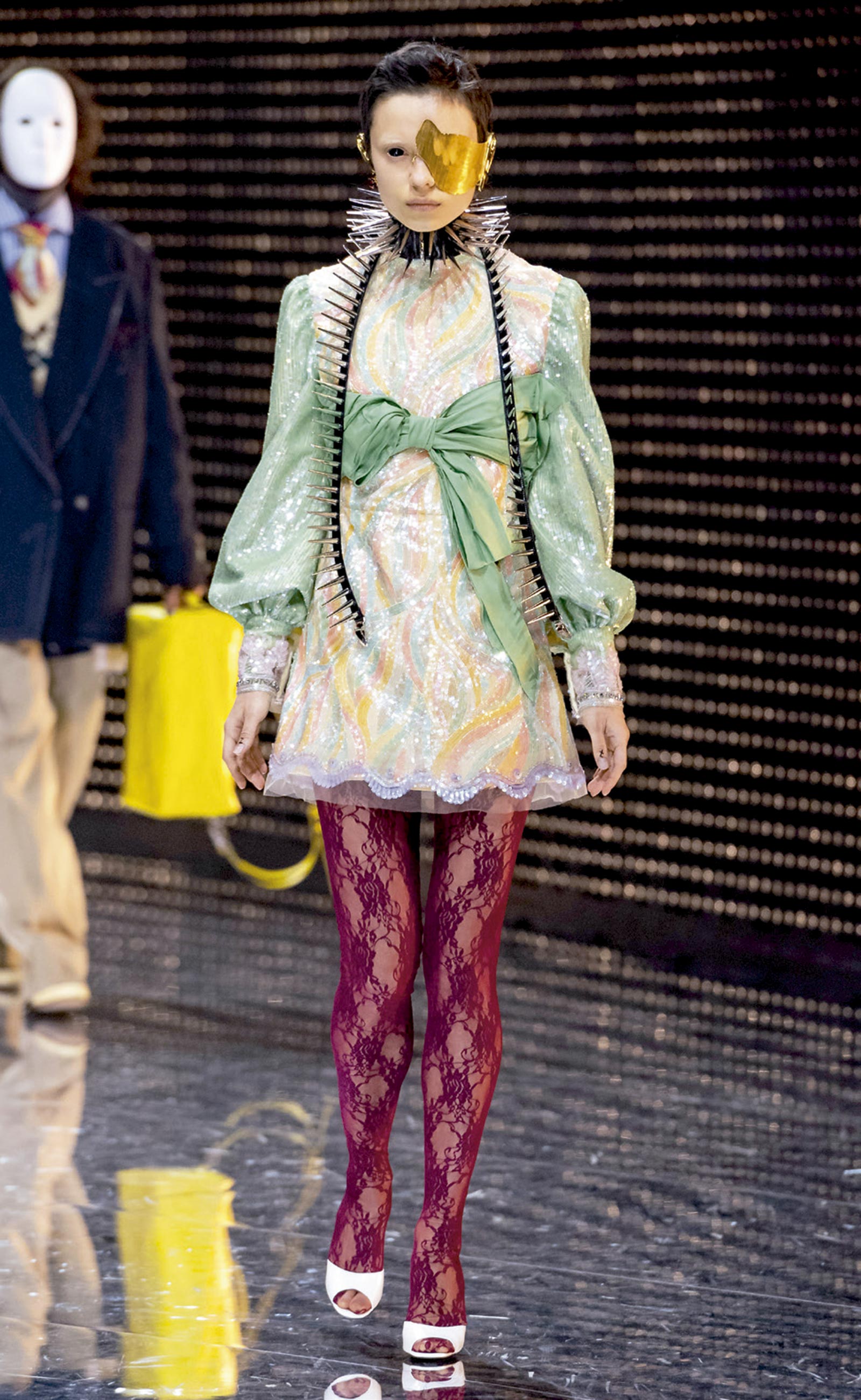 Na Gucci, os spikes vieram gigantes, arrematando acessórios e roupas em um discurso cerebral que também passa por questionamentos acerca do indivíduo, em especial do jovem contemporâneo. O que ele pensa? O que ele quer? Quem está por trás da máscara social? Colocações que ajudam a reforçar seu diretor criativo, Alessandro Michele, como uma das mentes mais questionadoras da moda contemporânea.