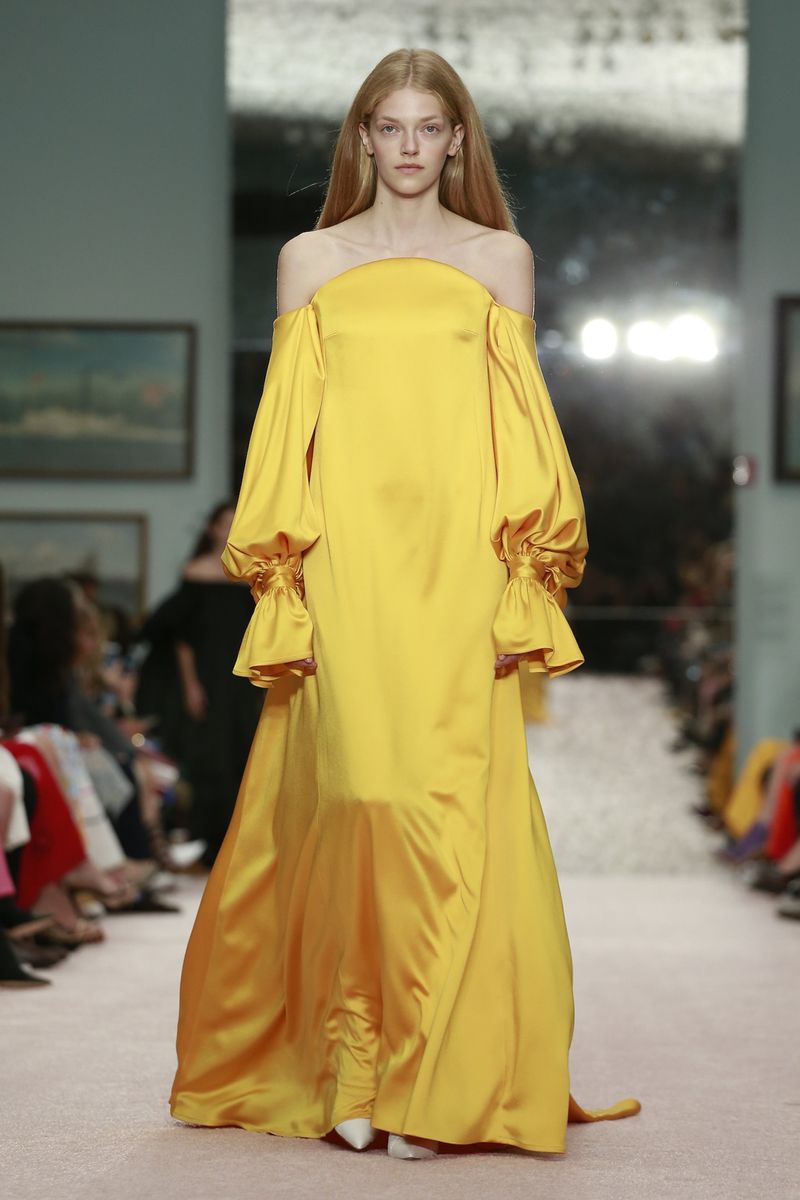 No mood da “Yellow Fever” que também tomou a temporada, temos os ombros de fora! Carolina Herrera optou pela modelagem arredondada, modernizando o look. As mangas bufantes enriquecem o ombro a ombro, que equilibram a silhueta do corpo.