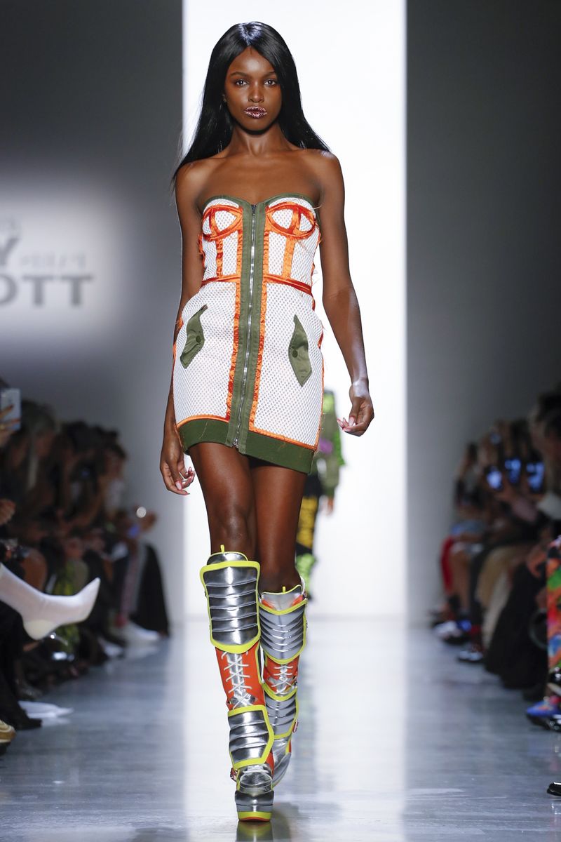 O tomara que caia de Jeremy Scott possui um ar de espartilho. As costuras marcadas pelo debrum laranja trazem um ar retrô para o modelo.