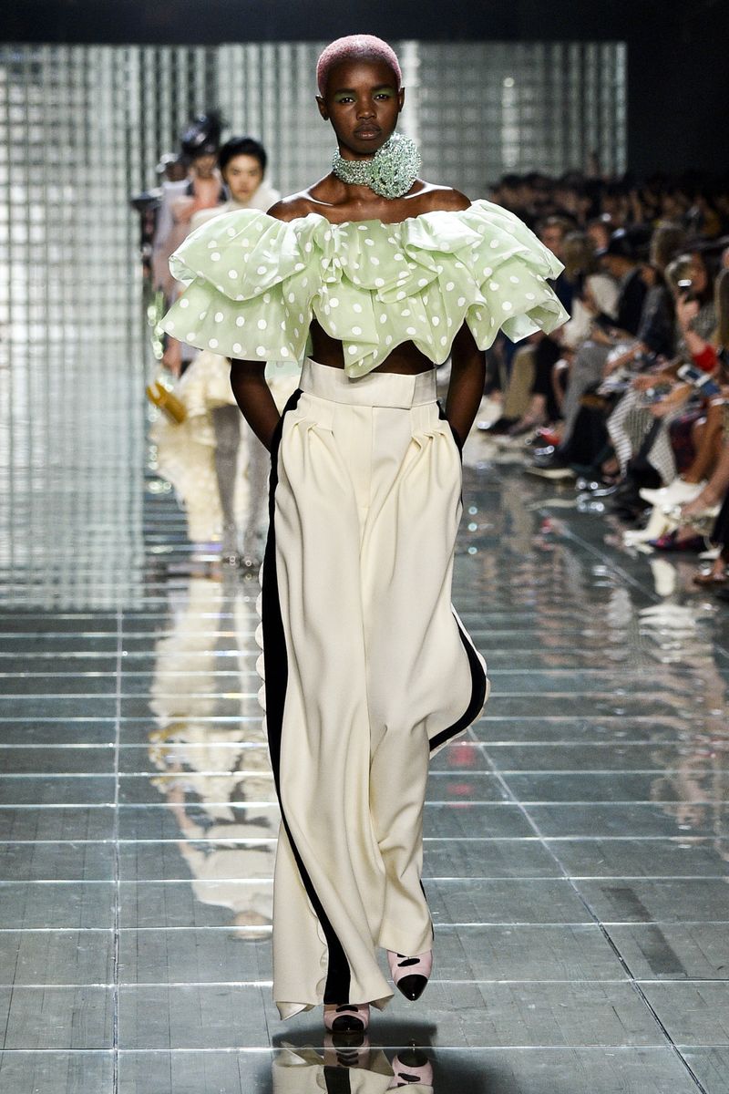 Com toda sua pompa, Marc Jacobs equilibrou suas modelagens oversized evidenciando os ombros. Os babados do cropped verde de poá chamam ainda mais atenção para a parte do corpo que está em alta.