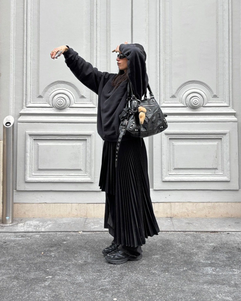 Hoje, o combo ganha novas camadas com o protagonismo das saias em versões volumosas, plissadas, com babados ou cortes dramáticos — muitas vezes em tecidos leves, texturizados ou estampas marcantes. Esse visual, que brinca com o exagero e a fluidez, encontra nos tênis um contraponto contemporâneo. E quanto mais inesperado o calçado, melhor: modelos robustos, coloridos, retrô ou com design esportivo ajudam a quebrar o romantismo das saias e adicionam informação de moda ao look. O resultado? Um contraste interessante e atual, que traduz bem o espírito da moda contemporânea — livre e versátil.