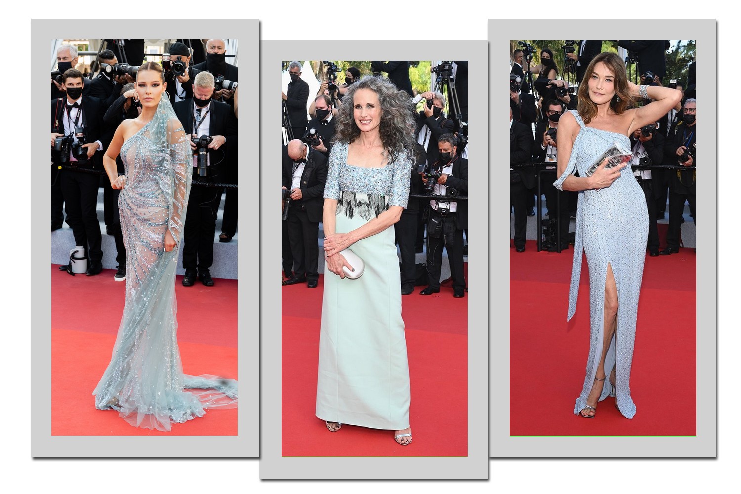 O azul foi uma tonalidade que conquistou as celebridades, principalmente em modelos que brincam com a transparência ou tons pastel. Maeva Coucke, de Ziad Nakad, Andie Macdowell, de Prada, e Carla Bruni, de Celine, apostaram na cor.
