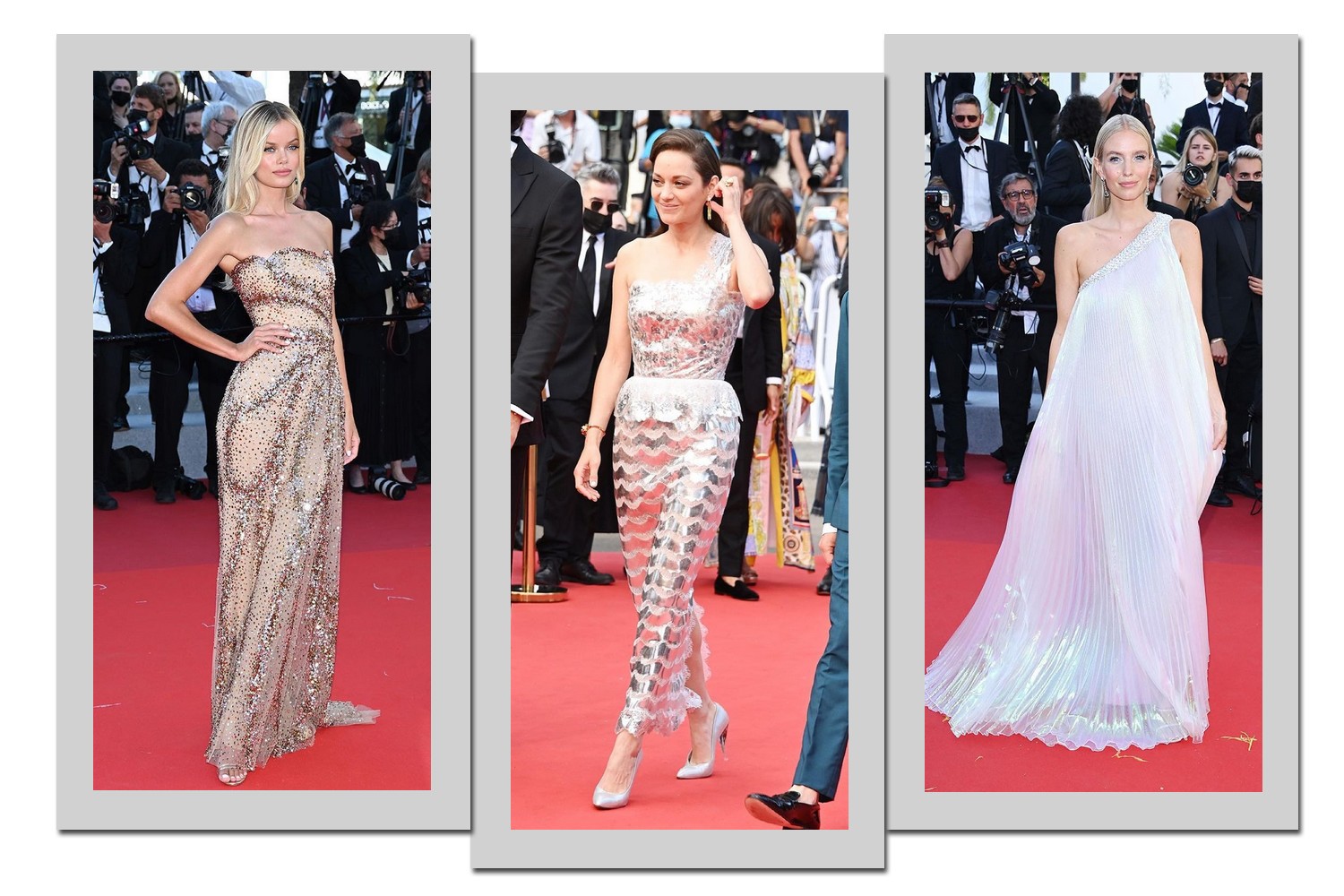 Além dos acabamentos metálicos, como no Elie Saab escolhido por Frida Aasen ou o Chanel usado por Marion Cotillard, os tecidos com efeitos holográficos dominaram Cannes. Leonie Hanne, de Tony Ward, e Didi Stone, de Philosophy di Lorenzo Serafini, optaram por este visual.