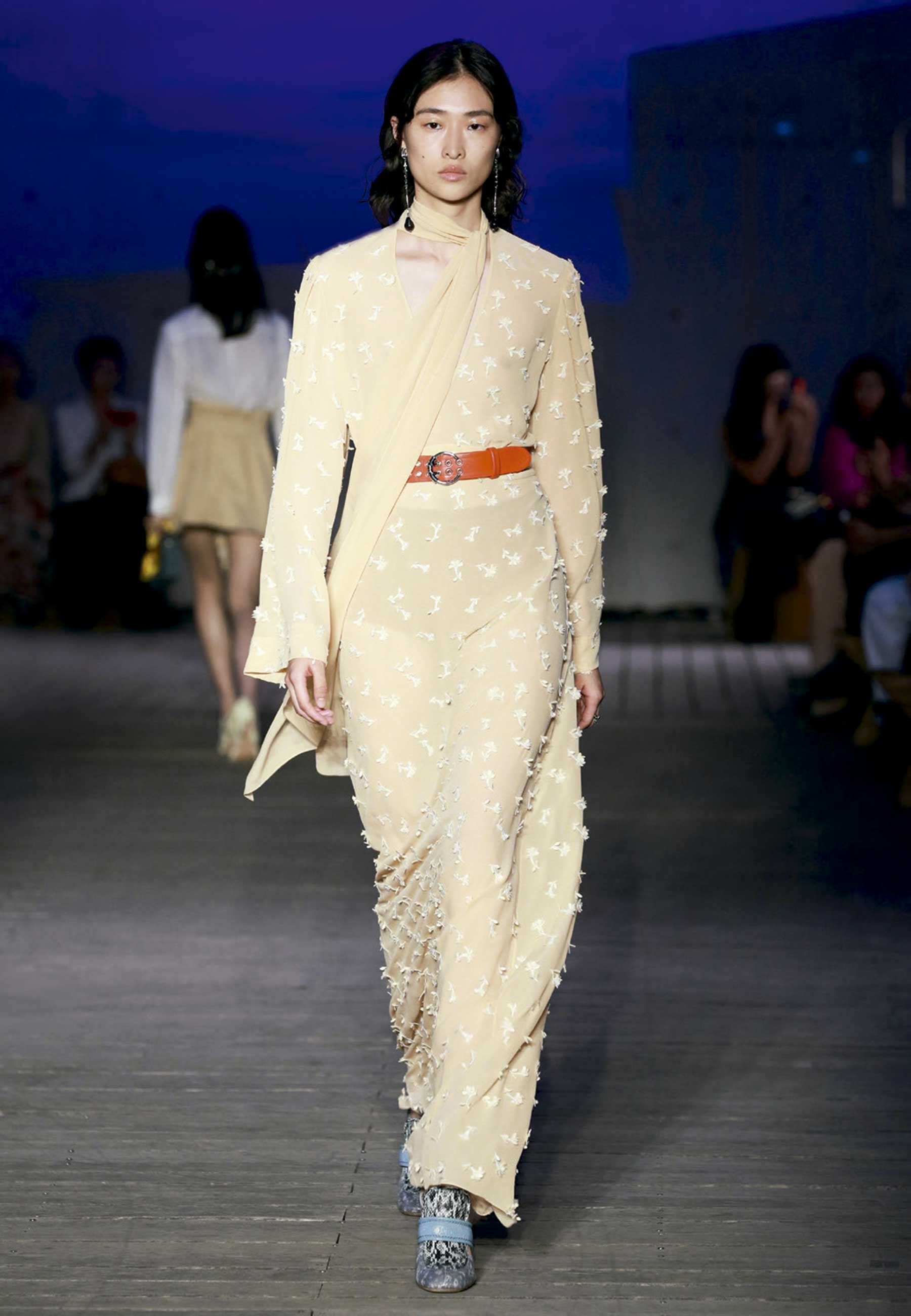 Para a Chloé, ela foi buscar inspiração em filmes conduzidos por nomes como Zhang Yimou, de “Lanternas Vermelhas”, “A Árvore do Amor” e do recente “One Second”, e Hou Hsiao-Hsien, de “Assassina”. São diretores que não escondem as adversidades da vida, mas reservam espaço privilegiado para o amor e a delicadeza. E assim veio temperada a coleção, representada por linhas art déco dividindo espaço com shapes esvoaçantes, e aquele bege como o de um doce cremino cruzando o percurso de um vermelho intenso.