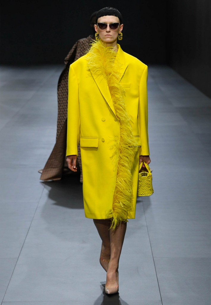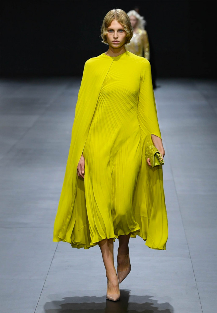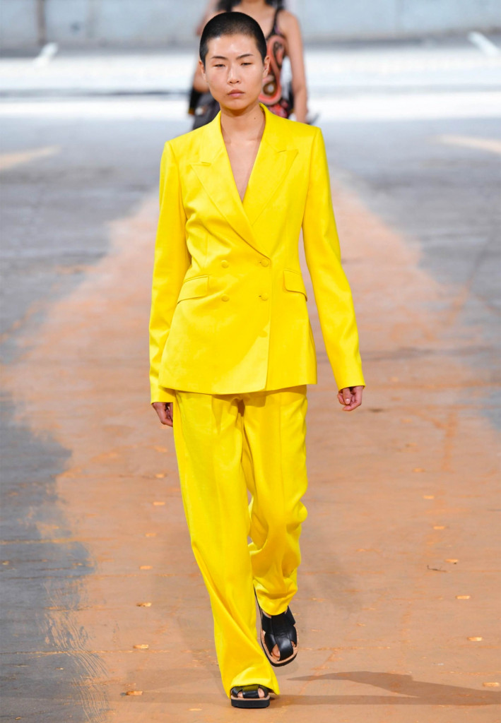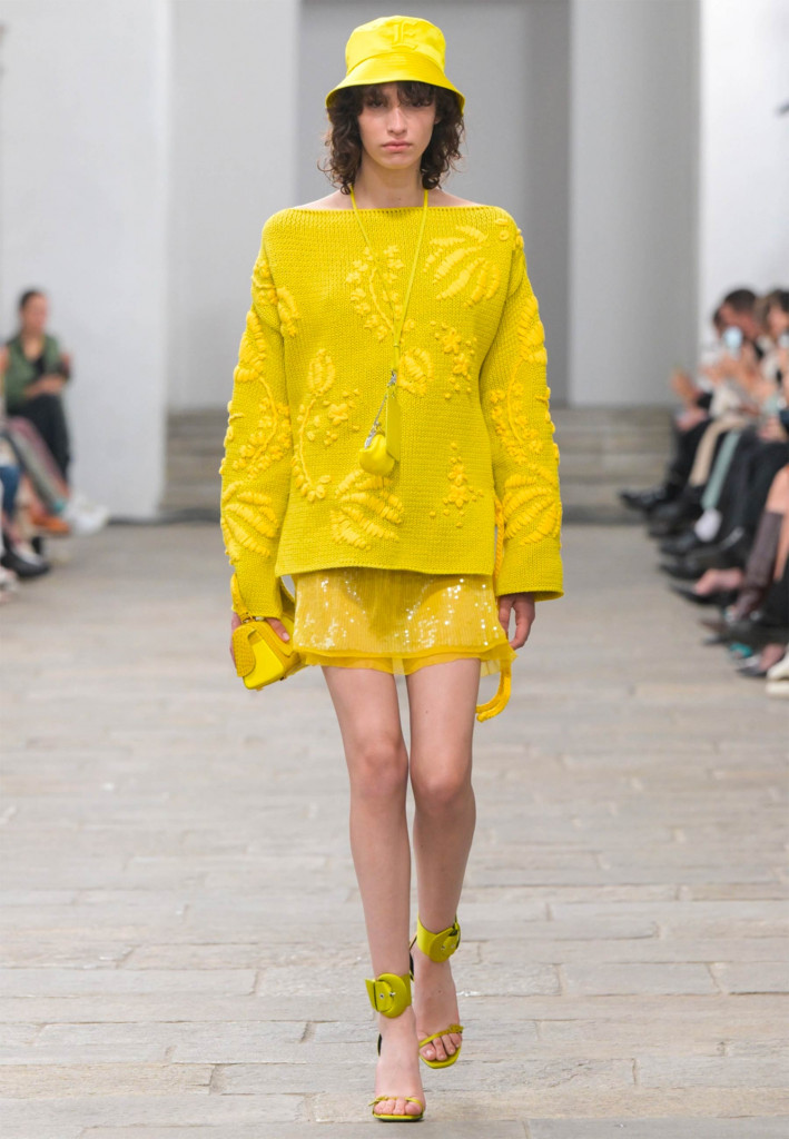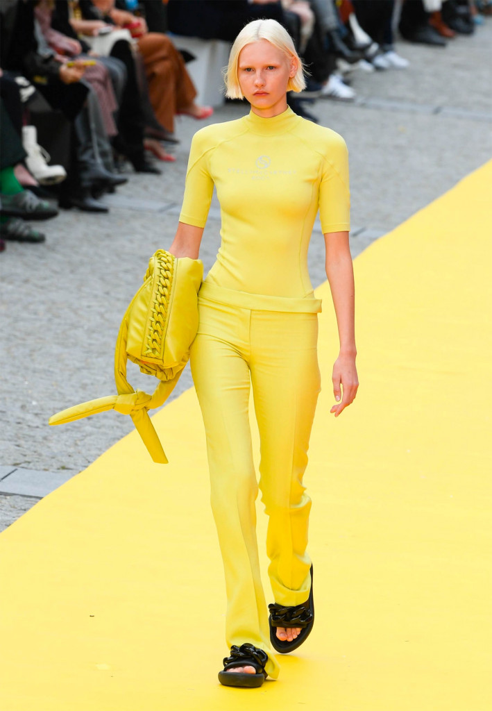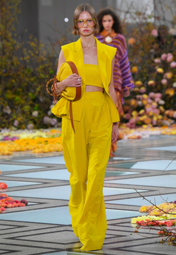 Eles apareceram principalmente em produções monocromáticas ou, em algumas exceções, combinados entre si, como no bordado com amarelo do look azul Tom Ford ou nas sandálias amarelas de Sara Battaglia. Outros designers optaram por combinar a paleta primária com acessórios pretos – mais convidativo para quem não está acostumado com cores tão intensas.