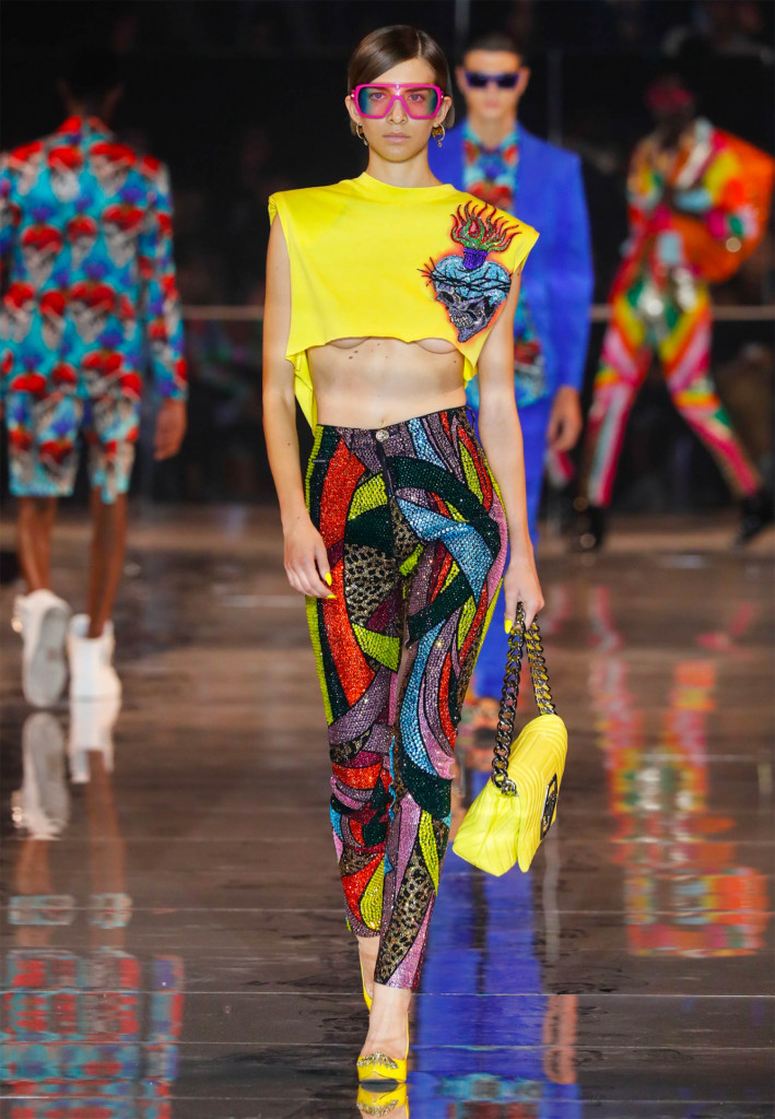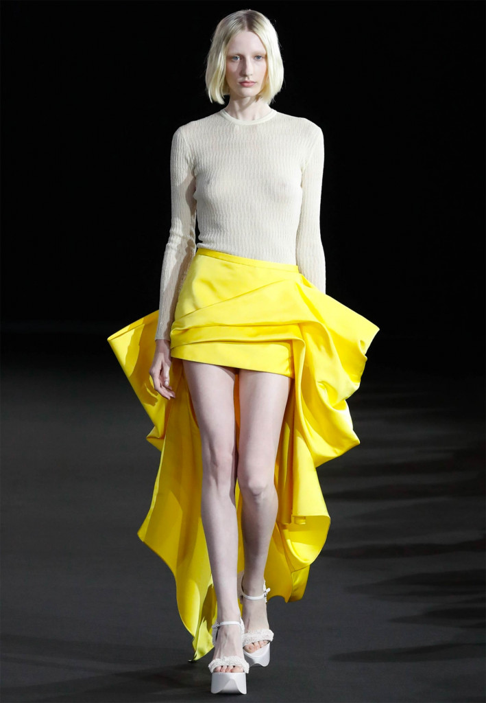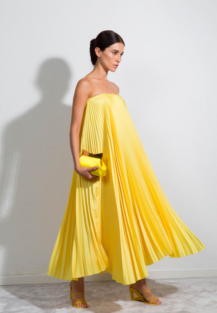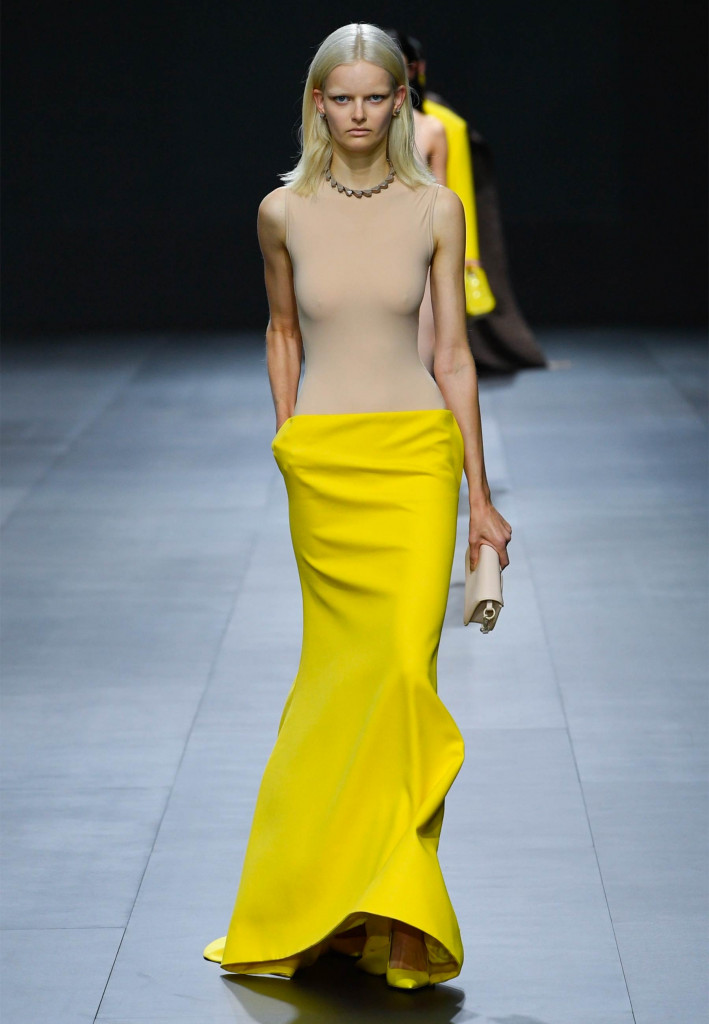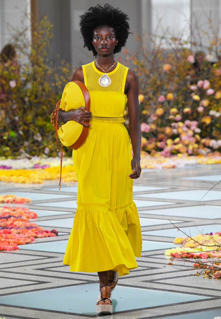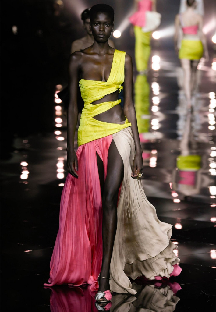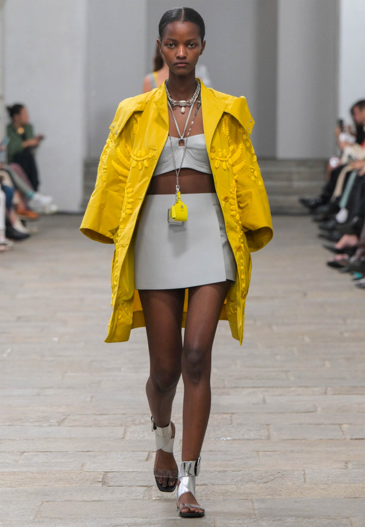 Eles apareceram principalmente em produções monocromáticas ou, em algumas exceções, combinados entre si, como no bordado com amarelo do look azul Tom Ford ou nas sandálias amarelas de Sara Battaglia. Outros designers optaram por combinar a paleta primária com acessórios pretos – mais convidativo para quem não está acostumado com cores tão intensas.