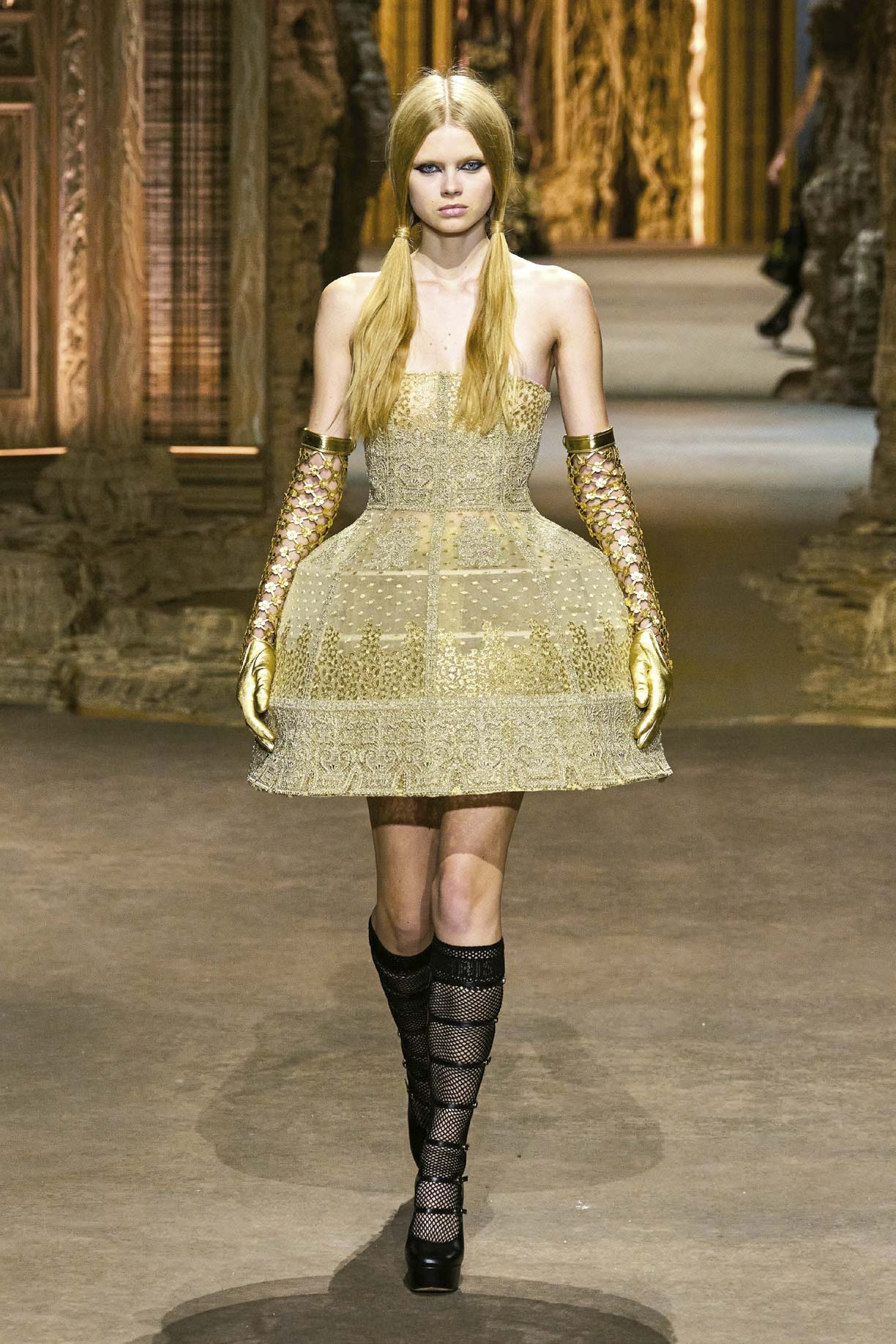 No desfile de verão 2023 da Dior, Maria Grazia Chiuri olhou para a figura da rainha Catarina de Médici e não foi tímida nas referências da majestade. Entre as saias armadas e a luvas em renda de couro, o tom do ouro afirma presença.