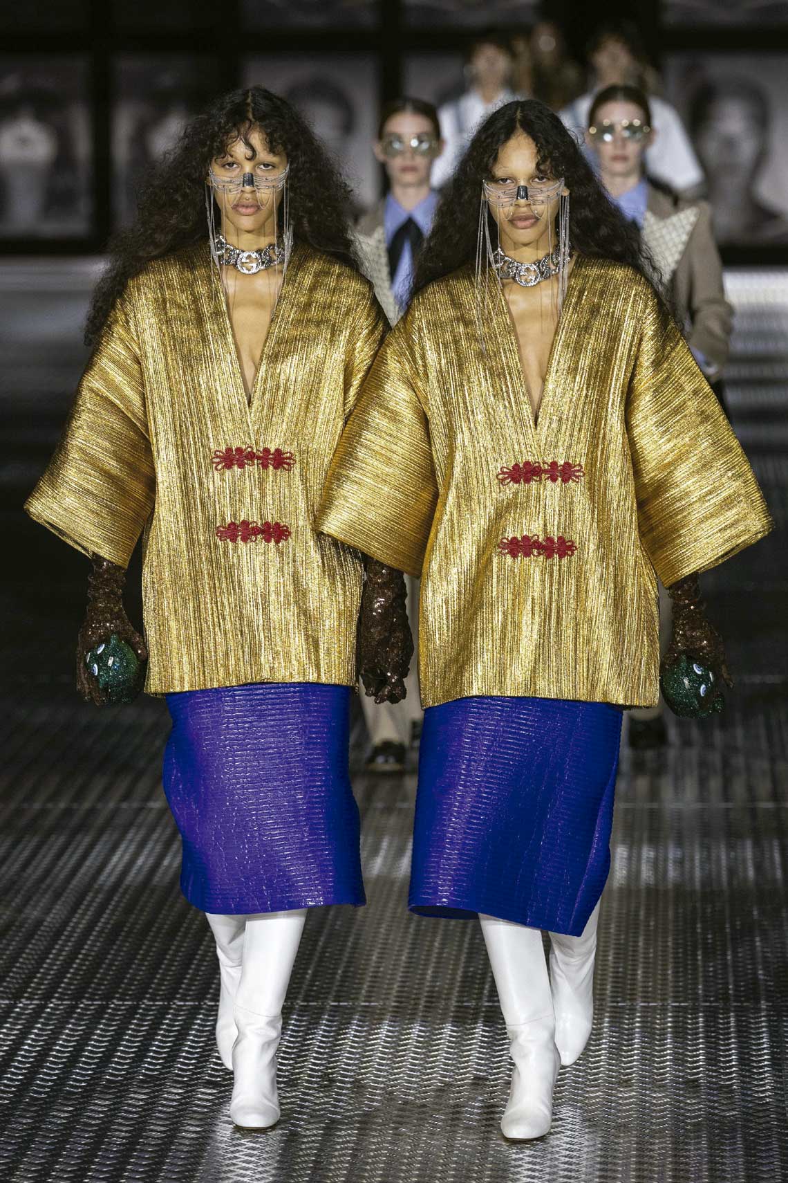 Se, para o monarca, dois tesouros valiam mais que um, Alessandro Michele seguiu a mesma lógica no último desfile que assinou para a Gucci. Marcando o fim de uma era, o público ainda não tinha ideia sobre a saída do designer quando ele enviou para passarela imagens duplicadas de suas criações modeladas por gêmeos. Entre elas, um par de kaftans brilhantemente dourados.