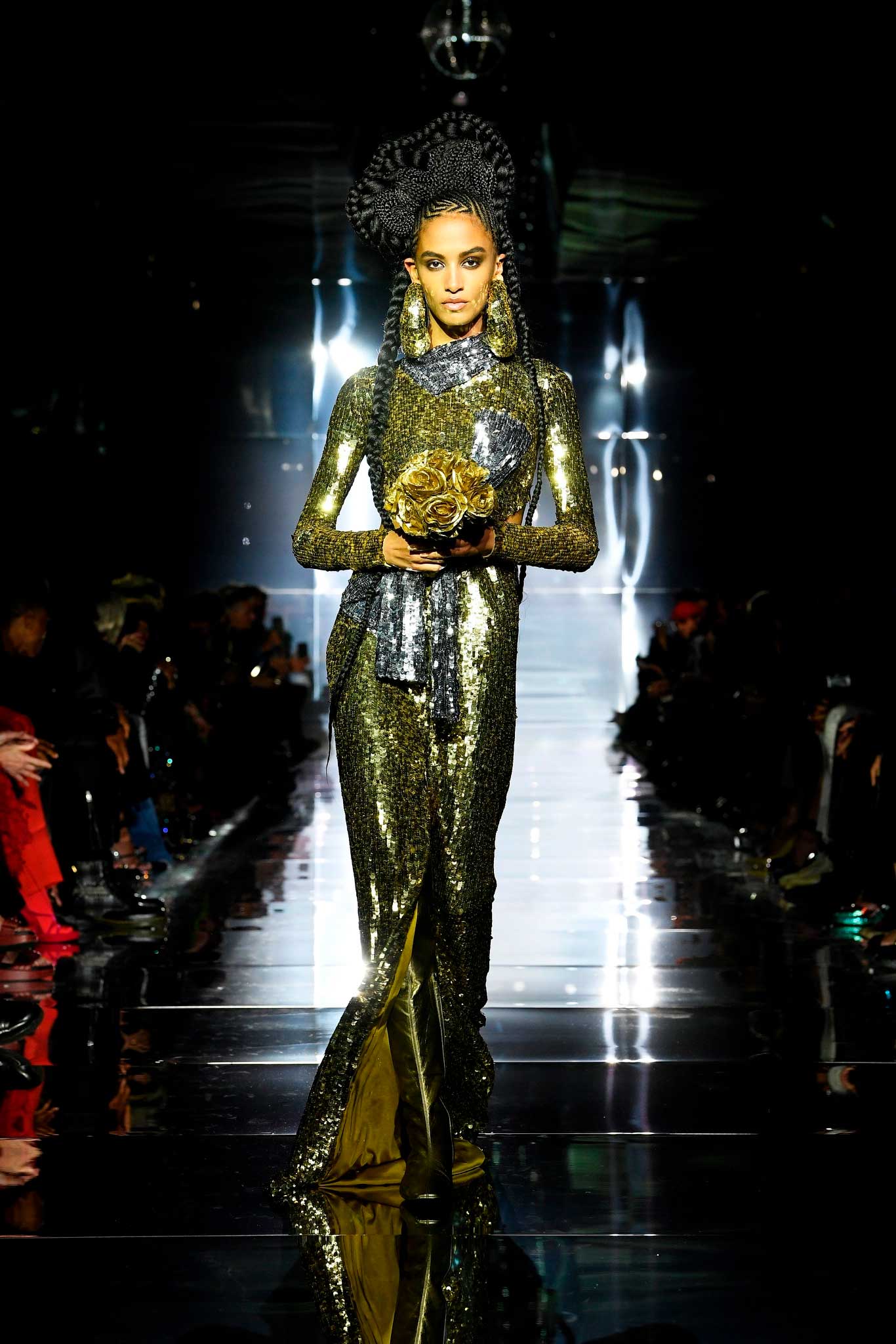 Também atraiu todos os olhares o vestido longo de festa, coberto por paetês dourados e recortes prateados, que Tom Ford escolheu para fechar sua apresentação na mesma temporada. Com um buquê de rosas douradas na mão, a modelo fez a vez de uma noiva digna de Frígia, reino grego que abrigou o trágico rei Midas, cujo toque transformava qualquer coisa em ouro.