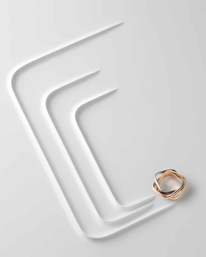 De todas as novidades, porém, as mais inovadoras parecem ser um trio de anéis em superelipses – quadrados com vértices arredondados –, que Cérède descreve como “um trabalho de enorme precisão”, e uma versão modular do design, cujos aros podem ser movidos “como em um quebra-cabeça Kumiki”. Aqui, a joia “fechada” pode ser usada como um anel único, enquanto “aberta” surge como três que, reunidos, revelam diamantes.