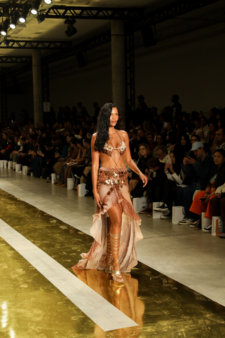 Uma sequência em preto e branco, marcada por referências à lingeries: rendas, armações de arame, laçarotes, franzidos e corsets. Depois, os tons terrosos tomaram conta da passarela, com maiôs em marrons e beges, como o modelo de escamas de tecido e o cinto de moedas.