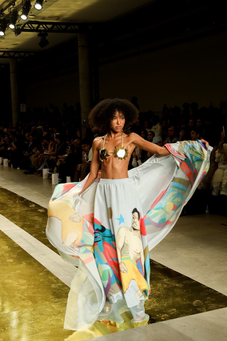 Em seguida, o clima mudou e, ao som de brega com batidas de funk, a coleção ganhou vida em cores primárias que vibraram em estampas inspiradas no trabalho do artista Glauco Rodrigues, que retratou um Brasil pop e moderno nos anos 1970. Outras peças com mensagens como “Yes! Nós temos banana!” e “Terras brasilis”, ecoaram humor e orgulho nacional.