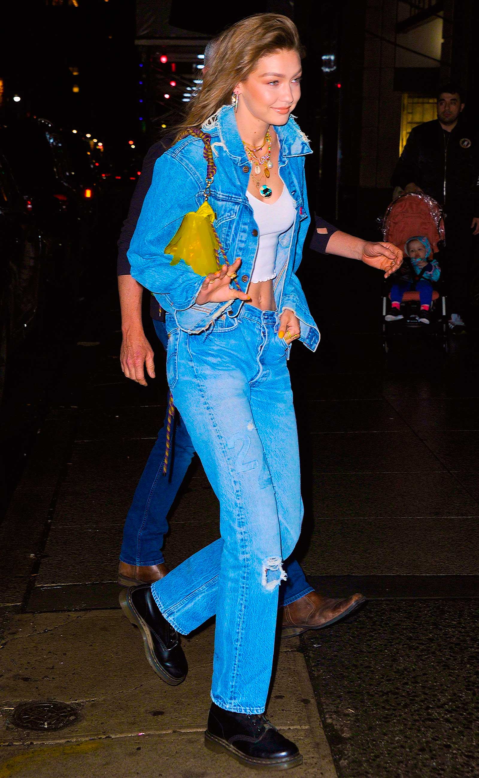 Gigi Hadid é referência mundial de street style. Apesar de camaleoa, existe um tecido que ela simplesmente ama: o jeans. Sempre fiel ao denim, ela usa o material em looks totais ou em peças pontuais. Na sua última aparição com o jeans, no dia 24 de abril de 2019, ela usou uma calça de cintura alta e modelagem oversized com um blazer cropped metalizado. Luxo!