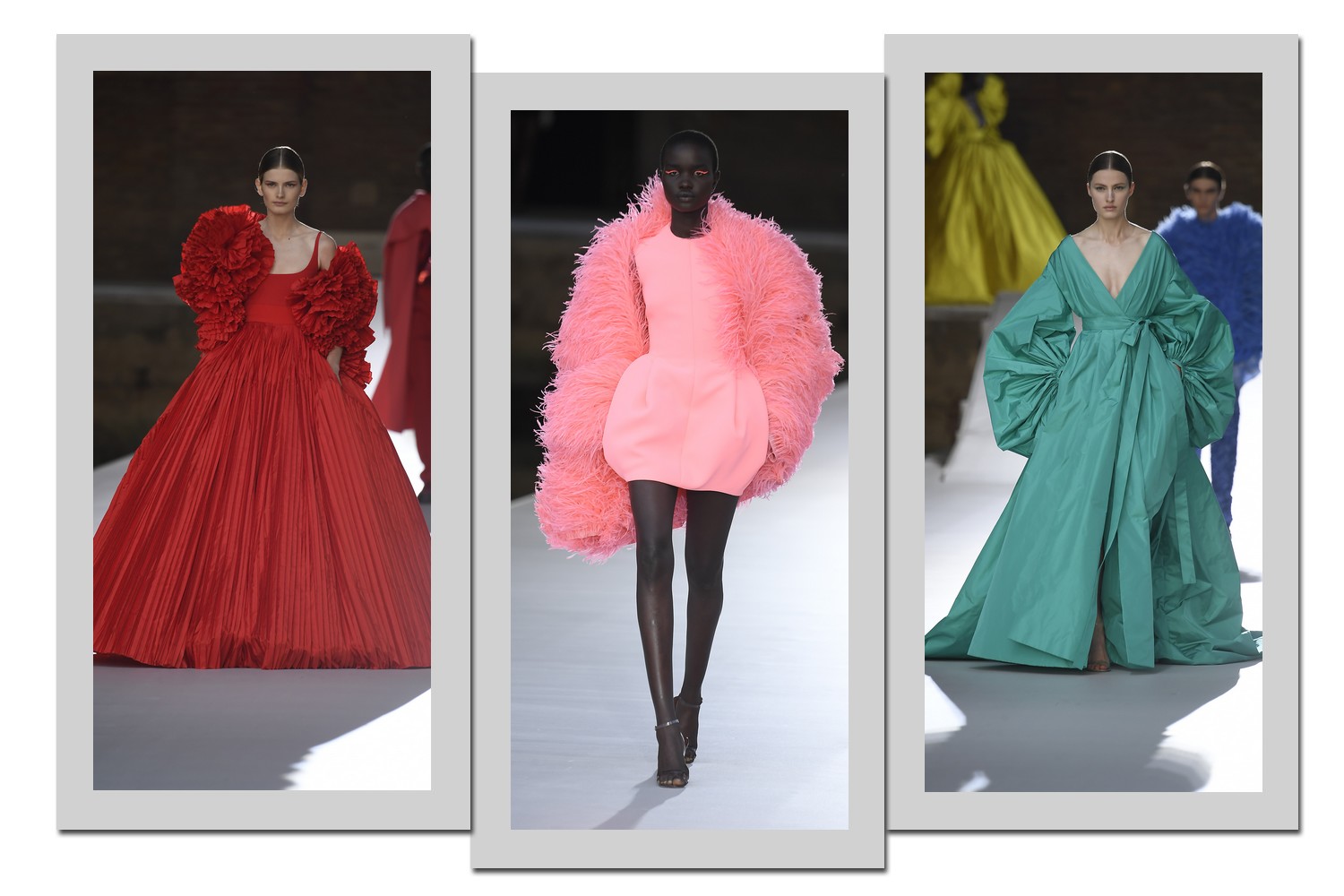 A Valentino utilizou diferentes técnicas para criar mangas volumosas e interessantes, como plumas, camadas que lembram flores, entre outros modelos.