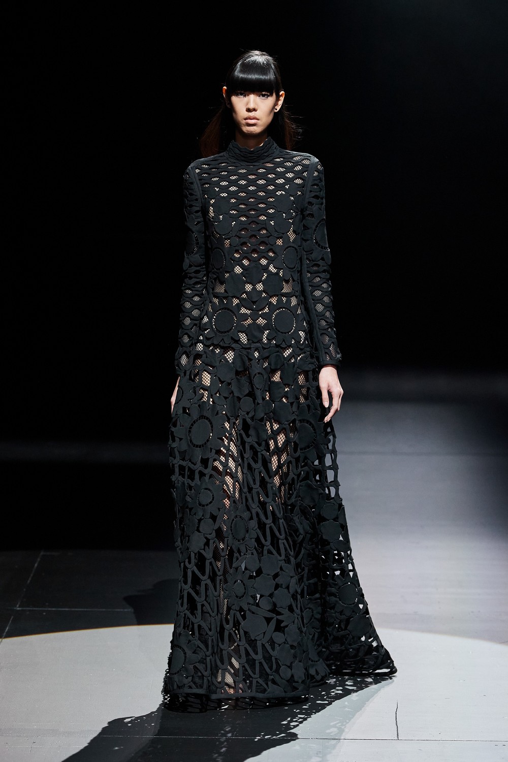 Esvoaçante, transparente e com um amplo decote, o vestido preto – usado por cima de uma segunda pele rendada – é uma das peças mais lindas da coleção.