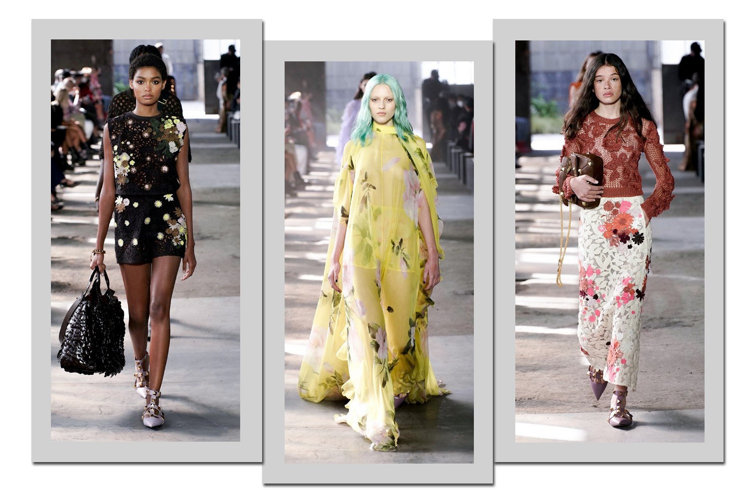 Assim como no cenário, as flores aparecem nas peças em rendas, prints e bordados.