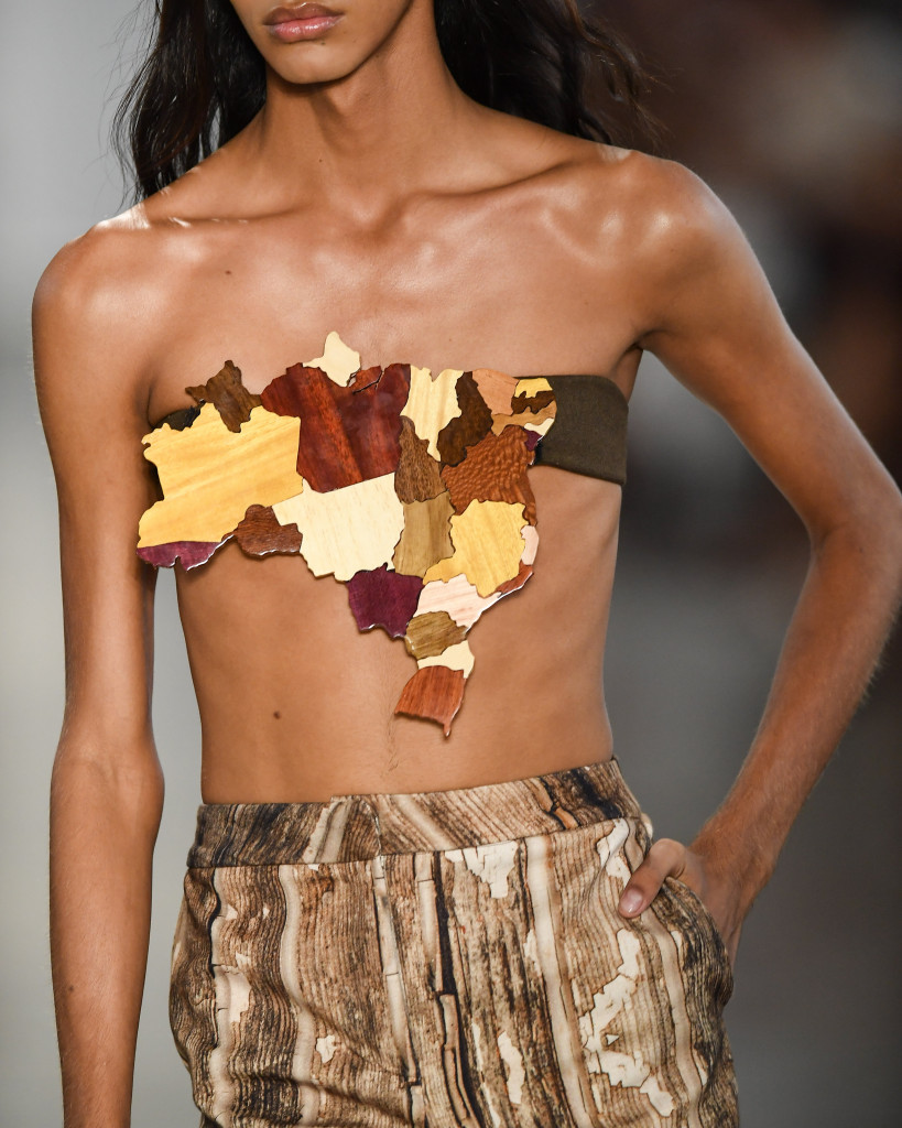 Cuias de tacacá, típicas de Belém, viraram busto de sobretudo e um top de marchetaria, no formato do mapa nacional (cada estado de uma madeira diferente), arrancou suspiros da plateia. Minutos antes do desfile, a peça ainda não tinha chegado, mas seu début deixou até a influenciadora Malu Borges de queixo caído.