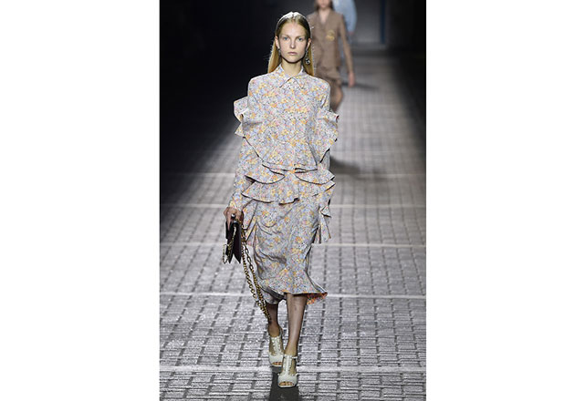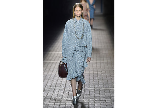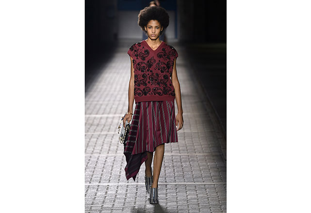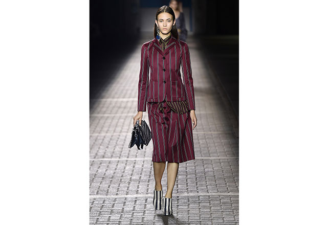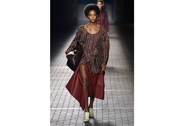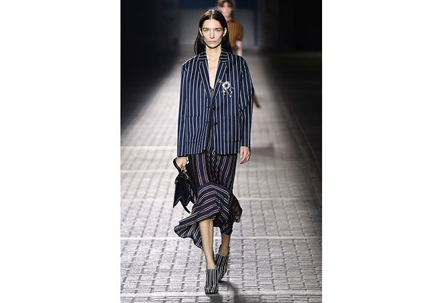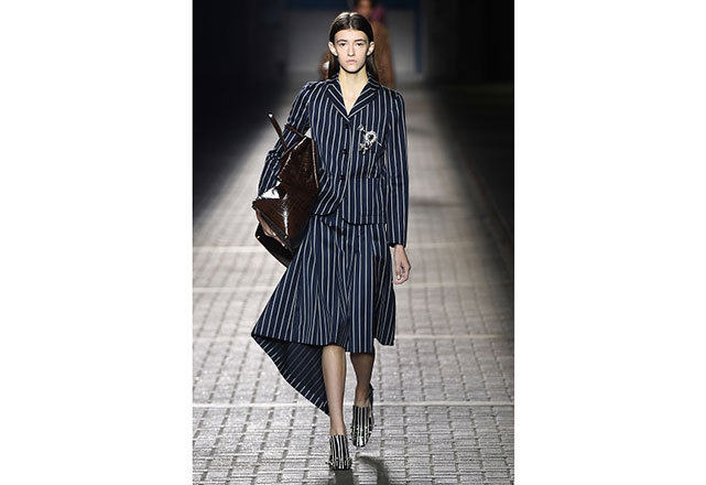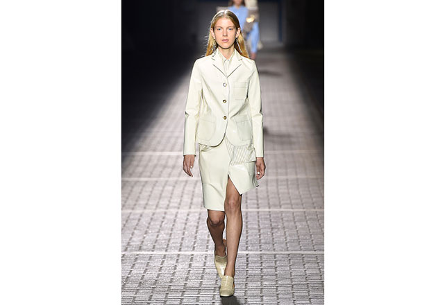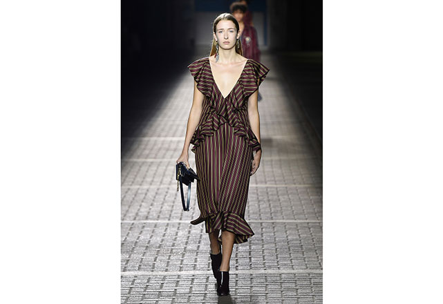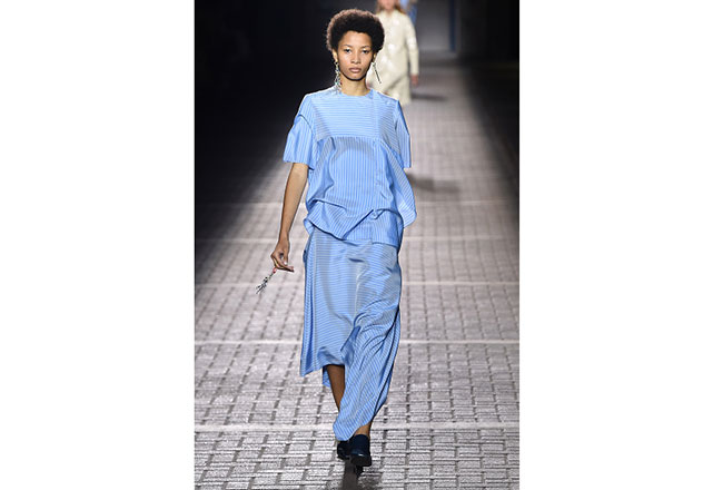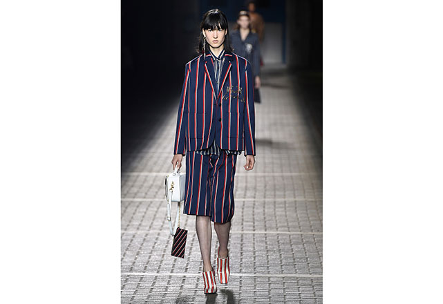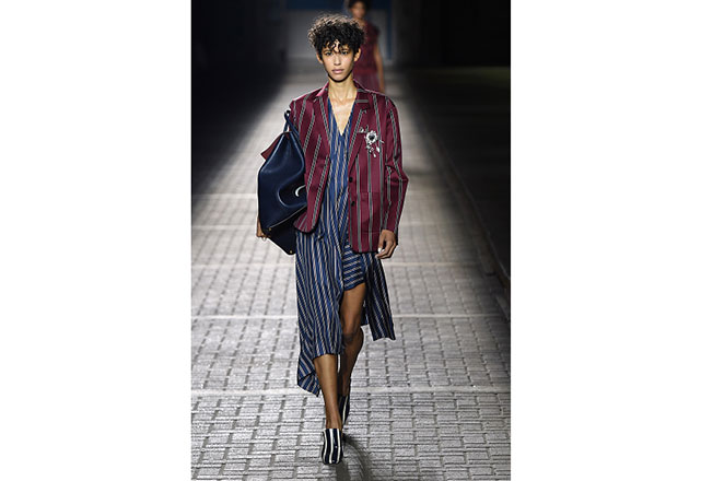 A Mulberry London apresenta um verão 2017 recheado com looks de alfaiataria moderna, listrada, com babados na diagonal e assimetrias e recortes. A segunda parte da apresentação fica mais monocromática e minimalista, com direito a um look inteiro prateado com pegada futurista. Destaque para as maxiclutches e sapatos de bico quadrado.