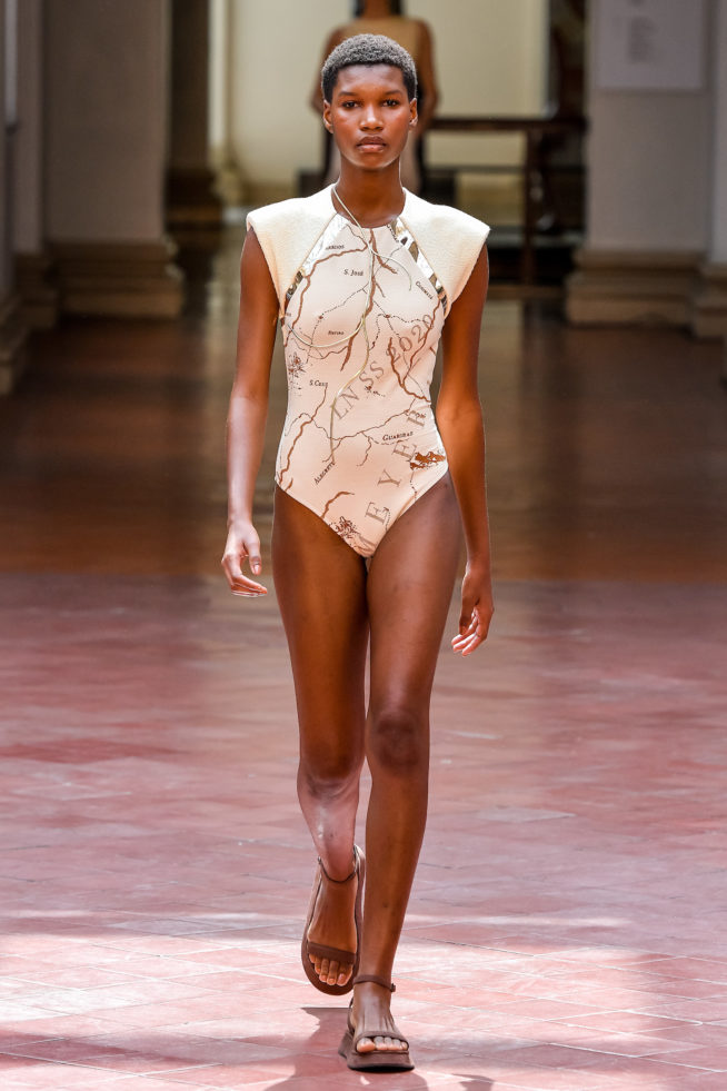 Prints e texturas cartográficas cobrem maiôs com recortes para lá de esculturais – esta é a proposta de Lenny Niemeyer para o verão 2020. As organzas sob as lycras de mesma estampa criam ilusões de óptica deste mundo desconhecido, elegante como sempre.